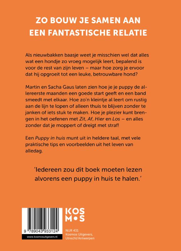 In ‘Een puppy in huis’ van Martin en Sacha Gaus staat alles wat ieder hondenbaasje moet weten over de opvoeding van een hond. Hoe leer je een puppy om buiten te plassen of om alleen thuis te blijven? En hoe kunnen kinderen veilig met de hond spelen? Met de beproefde methode in dit boek leer je hoe je de beste relatie met je pup kunt opbouwen, zodat hij goed luistert.