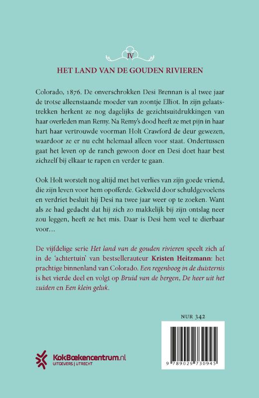 'Een regenboog in de duisternis' van Kristen Heitzmann gaat verder waar 'Een klein geluk' ophield. De onverschrokken Desi Brennan is net moeder geworden… én weduwe. Nadat ze ook de trouwe voorman Holt Crawford heeft ontslagen, staat ze er helemaal alleen voor. Terwijl ze worstelt om deze nieuwe realiteit onder ogen te zien, gaat het leven op de ranch gewoon door. Desi moet zichzelf bij elkaar rapen en verdergaan. Maar Holt legt zich niet zo gemakkelijk bij zijn ontslag neer. Daar is Desi hem te dierbaar voor…