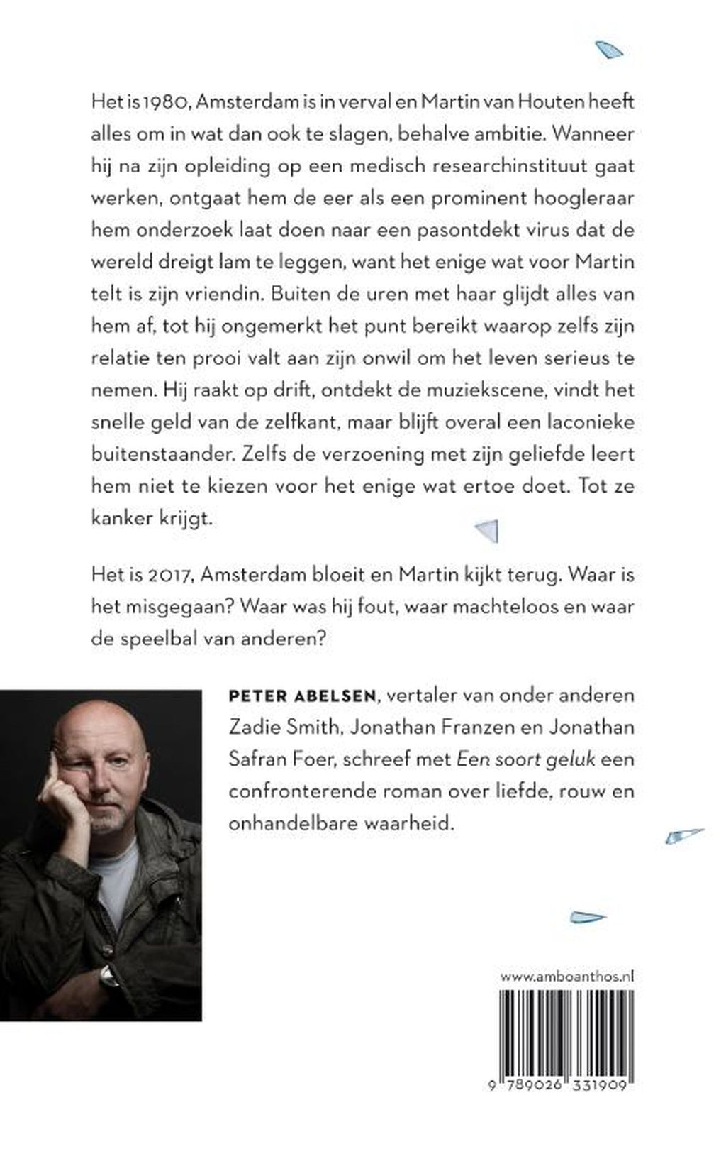 In ‘Een soort geluk’ van topvertaler Peter Abelsen heeft Martin van Houten alles om overal in te slagen, behalve geldingsdrang. Het enige wat voor Martin telt is de liefde voor zijn vriendin, tot zijn relatie stukloopt op zijn onwil om het leven serieus te nemen. Hij raakt op drift, blijft excelleren in al wat hem komt aanwaaien, maar, van de muziekscène tot de wereld van junks en hoeren, hij blijft overal een toeschouwer. Zelfs de verzoening met zijn geliefde brengt geen verandering in zijn levenshouding. Tot ze kanker krijgt. Als ze sterft, gaat zijn rouw gepaard met het besef van wat hij allemaal aan zich voorbij heeft laten gaan terwijl hij het in handen had. Een briefwisseling helpt hem zijn leven te reconstrueren en verzoening te vinden. ‘Een soort geluk’ van Peter Abelsen is een prachtige roman over rouw met autobiografische elementen.