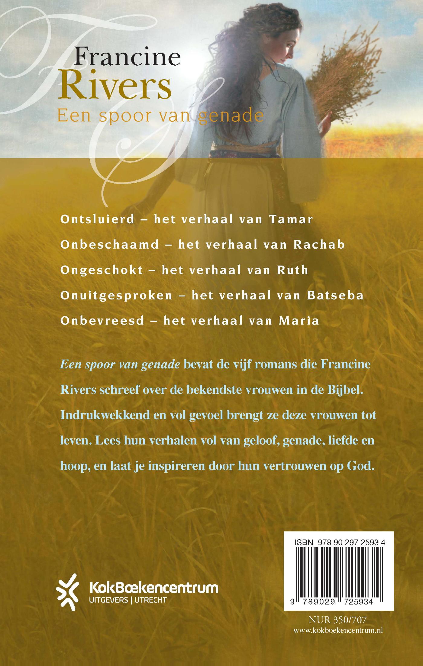 Alle vijf Bijbels-historische romans over vrouwen van bestsellerauteur Francine Rivers zijn nu gebundeld in een mooie uitgave: ‘Een spoor van genade.’De levens van Rachab, Maria, Ruth, Tamar en Batseba worden in dit boek door Francine Rivers tot leven gebracht. De lessen die wij van deze vrouwen kunnen leren, zijn nog steeds relevant, en gaan over thema’s als geloof, liefde, genade en hoop.