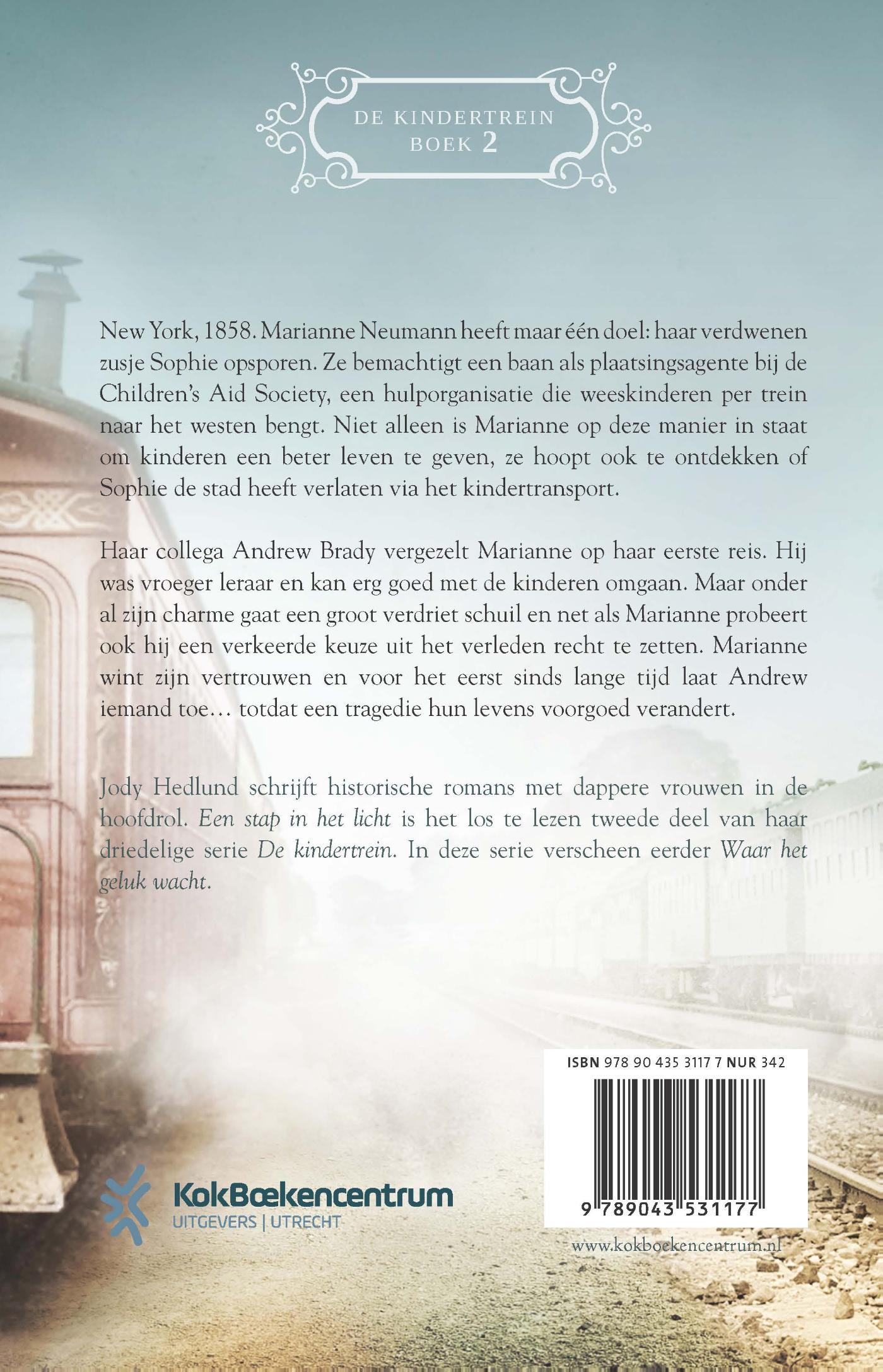 De historische roman ‘Een stap in het licht’ van Jody Hedlund is een verhaal vol liefde over de onbreekbare band tussen zussen. New York, 1858. Marianne Neumann heeft nog maar één doel: haar verdwenen zusje Sophie opsporen. Marianne bemachtigt een baan als plaatsingsagente bij een kinderhulporganisatie, waar ze niet alleen in staat is om kinderen een beter leven te geven, maar waar ze ook hoopt te ontdekken of Sophie de stad heeft verlaten via het kindertransport. Haar collega Andrew Brady vergezelt Marianne op haar eerste reis. Hij was vroeger leraar en kan erg goed met de kinderen omgaan. Maar onder al zijn charme schuilt een groot verdriet en net als Marianne probeert hij ook een verkeerde keuze uit het verleden recht te zetten. Marianne wint zijn vertrouwen en voor het eerst sinds lange tijd laat Andrew iemand toe… totdat een tragedie hun levens voorgoed verandert.