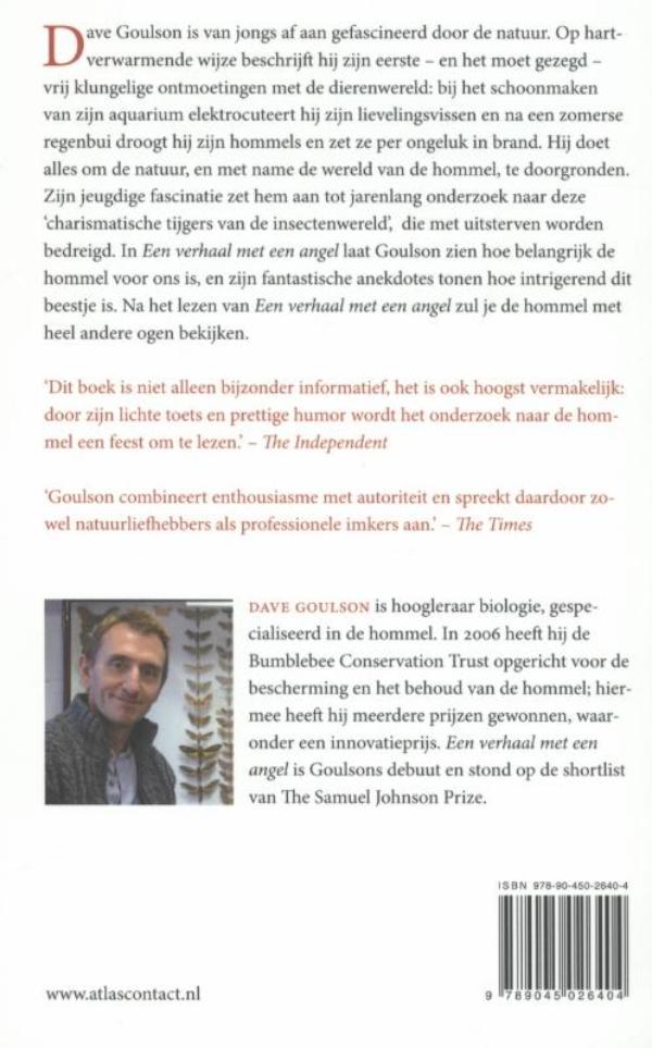 In 'Een verhaal met een ange'l laat Goulson zien hoe belangrijk én intrigerend de hommel is. Na het lezen van dit boek zul je de hommel met heel andere ogen bekijken.Dave Goulson is van jongs af aan gefascineerd door de natuur. Zijn eerste ontmoetingen met de dierenwereld zijn nog vrij klungelig: hij elektrocuteert per ongeluk zijn lievelingsvissen en als hij na een regenbui zijn hommels wil drogen, steekt hij ze in brand. Zijn jeugdige fascinatie richt zich met name op de hommel en zet hem aan tot jarenlang onderzoek naar deze ‘charismatische tijgers’ van de insectenwereld, die met uitsterven worden bedreigd.