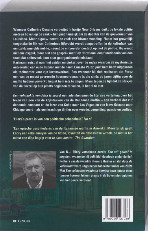 Wanneer Catherine Ducane verdwijnt in New Orleans duikt de lokale politie er meteen bovenop; het gaat namelijk om de dochter van de gouverneur van Louisiana. Maar algauw neemt de zaak een bizarre wending. Nadat het gruwelijk toegetakelde lijk van Catherines lijfwacht wordt aangetroffen in de kofferbak van een oldsmobile, neemt de ontvoerder contact op met de politie. Hij vraagt niet om losgeld, maar eist een gesprek met Ray Hartmann, een functionaris van een in Washington gevestigd team dat onderzoek doet naar georganiseerde misdaad. Hartmann reist af naar het diepe zuiden, terwijl hij zich afvraagt waarom de mysterieuze ontvoerder, een oude Cubaan met de naam Ernesto Perez, juist hém heeft uitgekozen als toehoorder voor zijn levensverhaal. Pas wanneer hij zich realiseert dat Perez een van de meest gevreesde huurmoordenaars is die sinds de jaren vijftig voor de maffia hebben gewerkt, begint hem iets te dagen. Maar tegen de tijd dat de stukjes van de puzzel op hun plaats beginnen te vallen, is het al te laat. Een volmaakte vendetta is zowel een adembenemende literaire vertelling over het leven van een van de kopstukken van de Italiaanse maffia een verhaal dat vijf decennia omspant en de lezer van Cuba naar Las Vegas en van New Orleans naar Chicago voert als een krachtige thriller over woede, vergelding, passie en verlies. Van R.J. Ellory verscheen eerder Een stil geloof in engelen, waarmee hij definitief doorbrak onder liefhebbers van de waarlijk literaire thriller en dat door de Volkskrant werd uitgeroepen tot beste thriller van 2009. Met Een volmaakte vendetta bewijst deze auteur eens temeer hoezeer hij een plaats in de bovenste regionen van het genre verdient. '