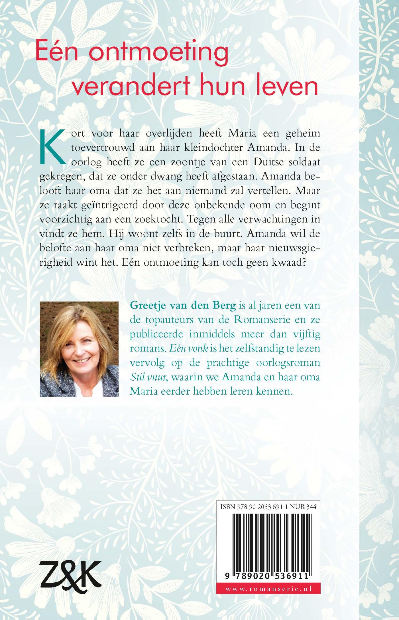 'Eén vonk' is het los te lezen vervolg op 'Stil vuur', waarin we Amanda al goed hebben leren kennen. In 'Eén vonk' belicht Greetje van den Berg een heel andere kant van het verhaal.