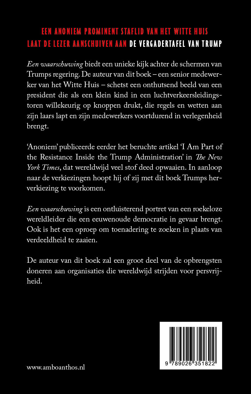 Een waarschuwing (de Nederlandse vertaling van A Warning) laat de lezer aanschuiven aan de vergadertafel van Trump. Geschreven door een anoniem en prominent staflid van het Witte Huis.