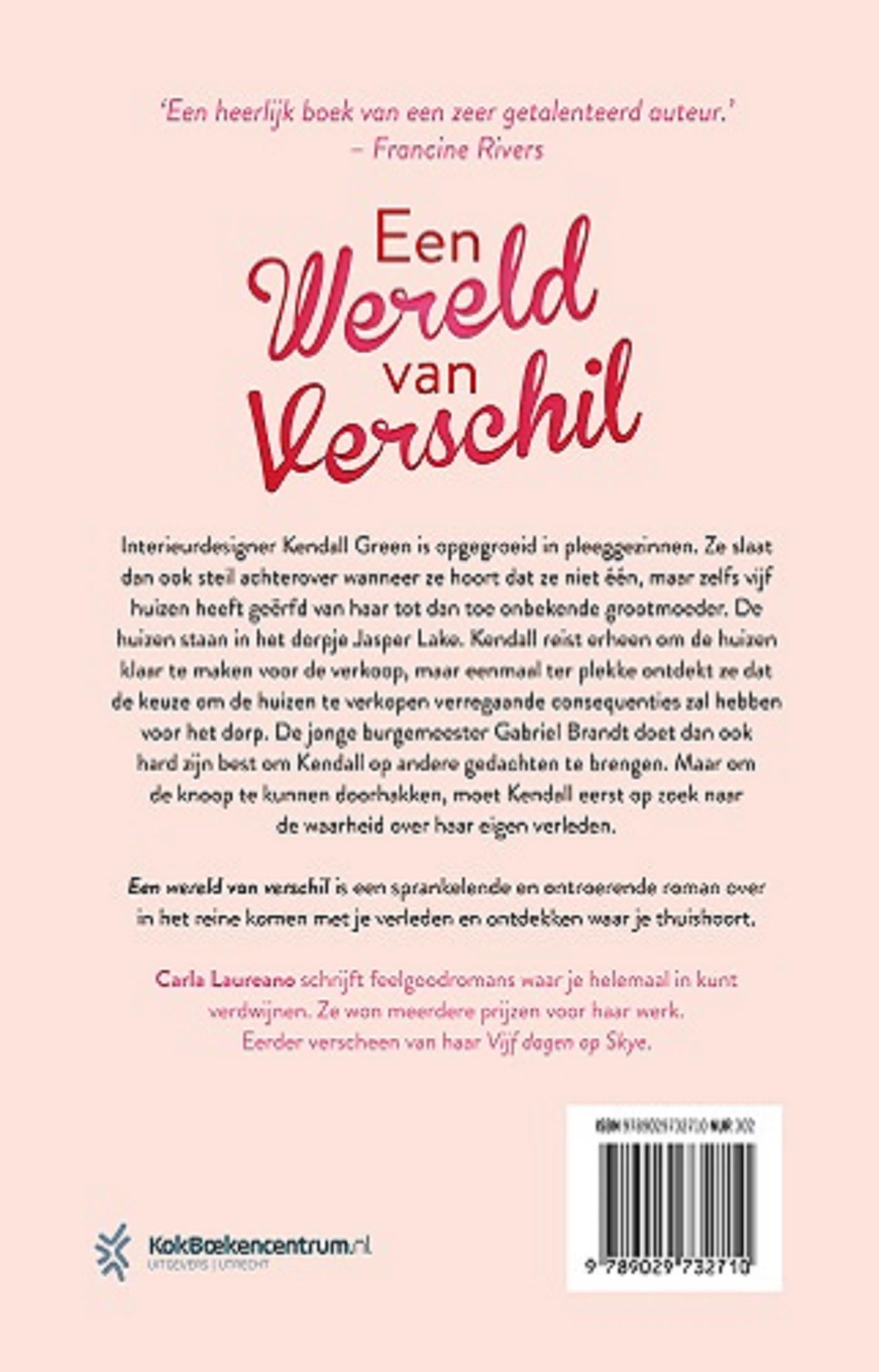 ‘Een wereld van verschil’ van Carla Laureano is een psychologische feelgoodroman. Interieurdesigner Kendall Green is opgegroeid in pleeggezinnen. Ze slaat dan ook steil achterover wanneer ze hoort dat ze niet één, maar liefst vijf huizen heeft geërfd van haar tot dan toe onbekende grootmoeder. De huizen staan in het dorpje Jasper Lake. Kendall reist erheen om de huizen klaar te maken voor de verkoop, maar eenmaal ter plekke ontdekt ze dat de keuze om de huizen te verkopen verregaande consequenties zal hebben voor het dorp. De jonge burgemeester Gabriel Brandt doet dan ook hard zijn best om Kendall op andere gedachten te brengen. Maar om de knoop te kunnen doorhakken, moet Kendall eerst op zoek naar de waarheid over haar eigen verleden.