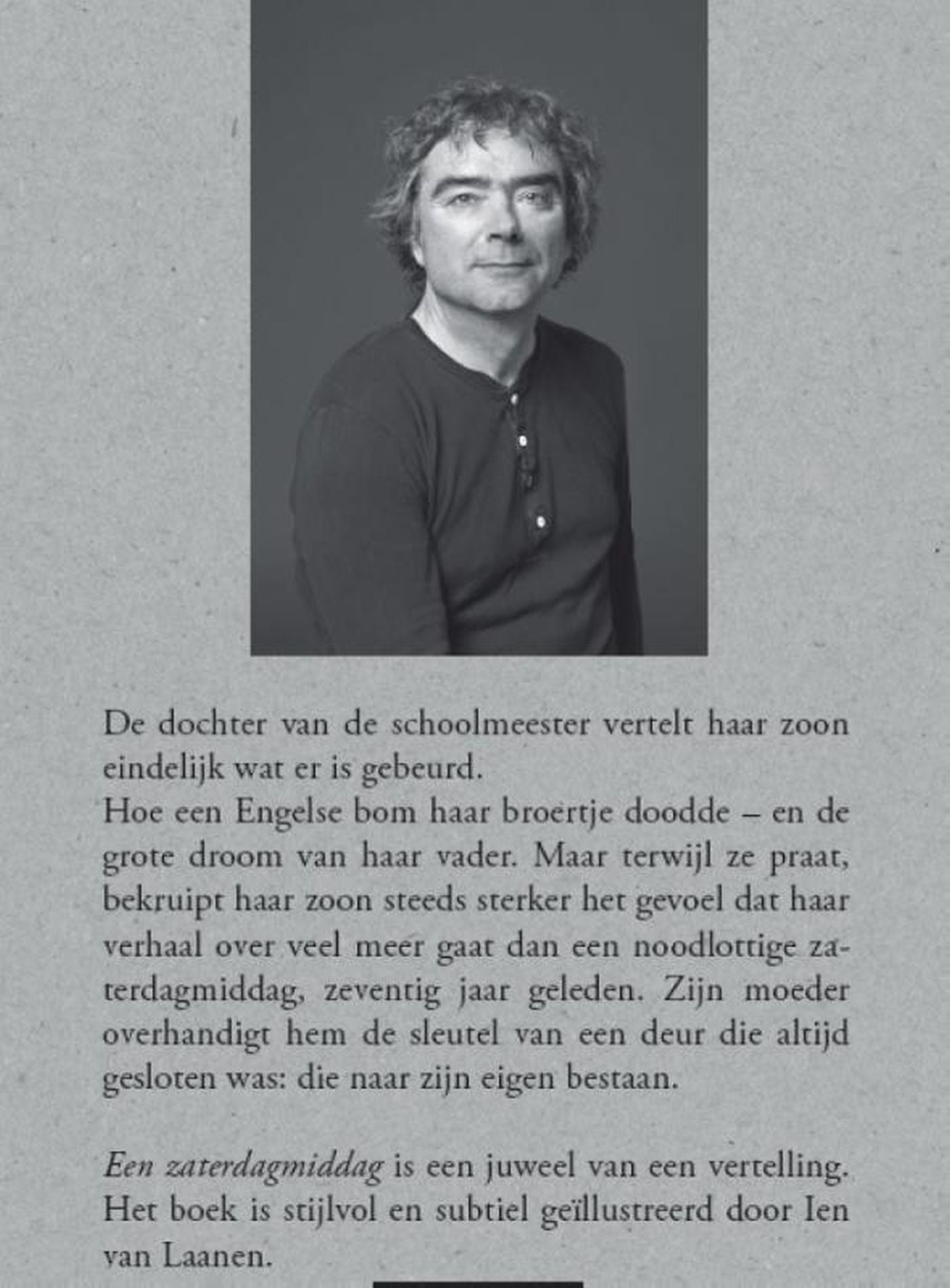 In het oorlogsverhaal ‘Een zaterdagmiddag’ van Bert Wagendorp vertelt de dochter van de schoolmeester haar zoon eindelijk wat er is gebeurd. Hoe een Engelse bom haar broertje doodde - en de grote droom van haar vader. Maar terwijl ze praat, bekruipt haar zoon steeds sterker het gevoel dat haar verhaal over veel meer gaat dan een noodlottige zaterdagmiddag, zeventig jaar geleden. Zijn moeder overhandigt hem de sleutel van een deur die altijd gesloten was: die naar zijn eigen bestaan. Het boek is stijlvol en subtiel geïllustreerd door Ien van Laanen.