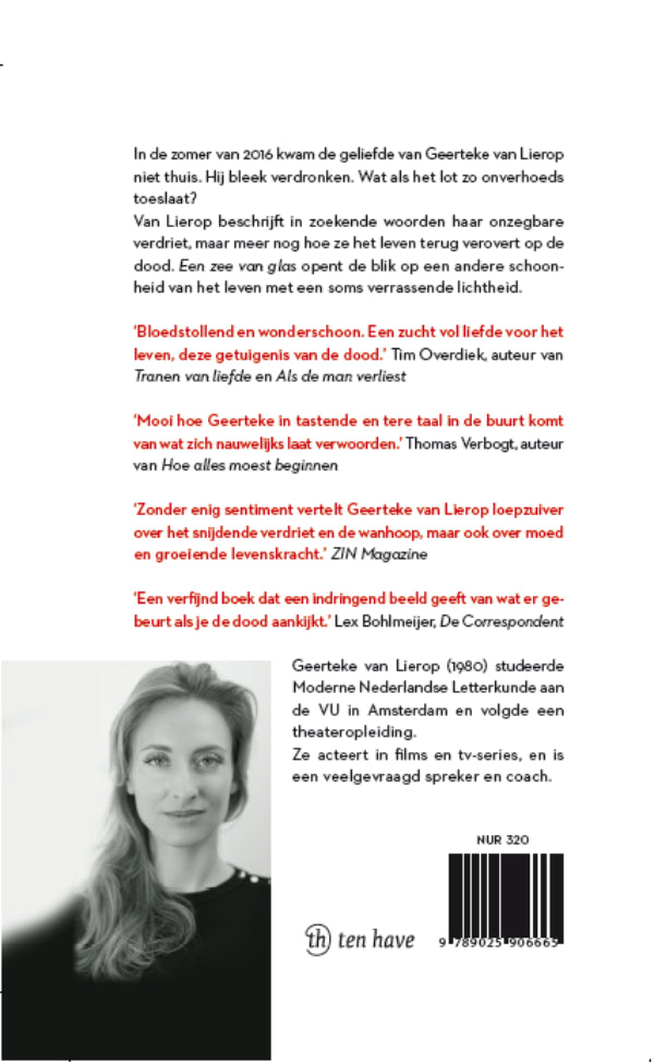 In de zomer van 2016 kwam de geliefde van Geerteke van Lierop niet thuis. Hij bleek verdronken. Wat als het lot zo onverhoeds toeslaat Van Lierop beschrijft in zoekende woorden haar onzegbare verdriet, maar meer nog hoe ze het leven terug verovert op de dood. Een zee van glas opent de blik op een andere schoonheid van het leven met een soms verrassende lichtheid.