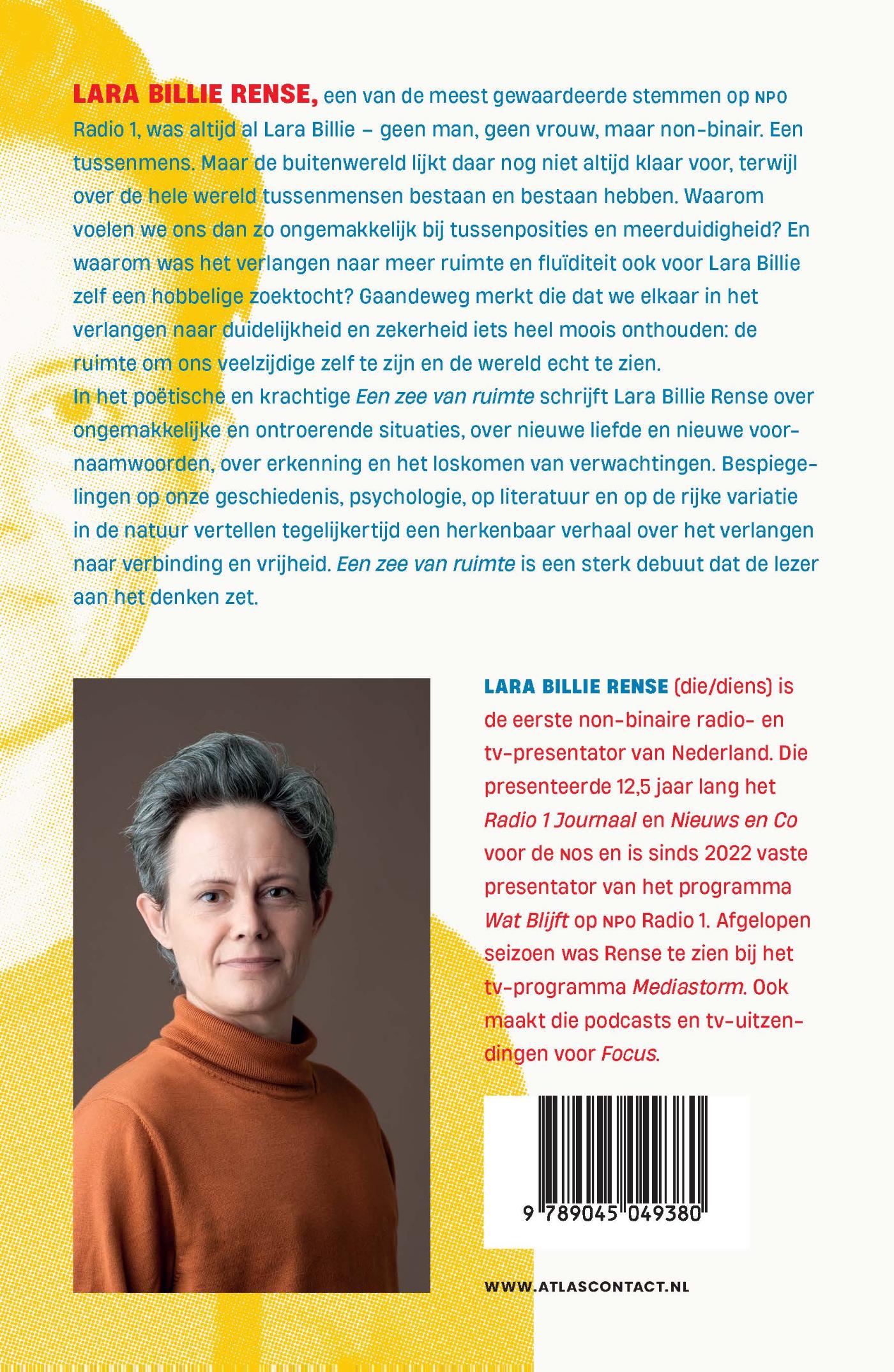 In het poëtische en krachtige Een zee van ruimte schrijft Lara Billie Rense over ongemakkelijke en ontroerende situaties, over nieuwe liefde en nieuwe voornaamwoorden, over erkenning en het loskomen van verwachtingen. Bespiegelingen op onze geschiedenis, psychologie, op literatuur en op de rijke variatie in de natuur vertellen tegelijkertijd een herkenbaar verhaal over het verlangen naar verbinding en vrijheid. Een zee van ruimte is een sterk debuut dat de lezer aan het denken zet.