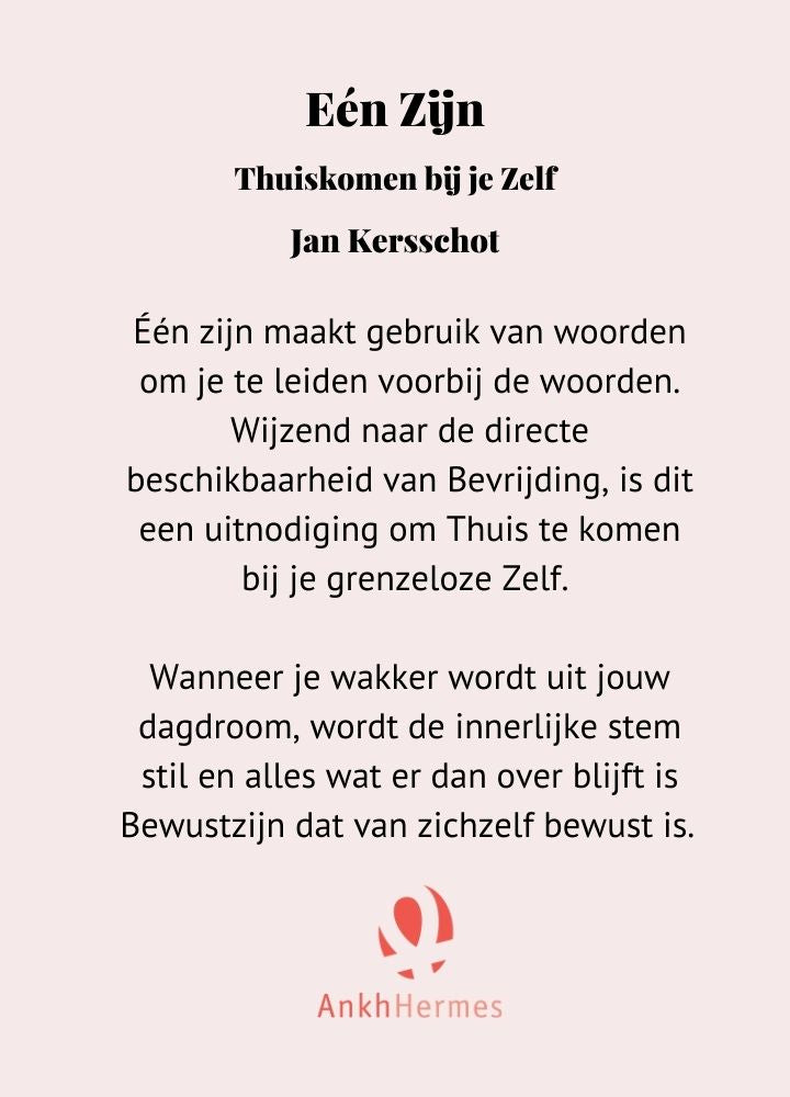 Één zijn. Thuiskomen bij je Zelf van Jan Kersschot maakt gebruik van woorden om je te leiden voorbij de woorden. Wijzend naar de directe beschikbaarheid van Bevrijding, is dit een uitnodiging om Thuis te komen bij je grenzeloze Zelf.