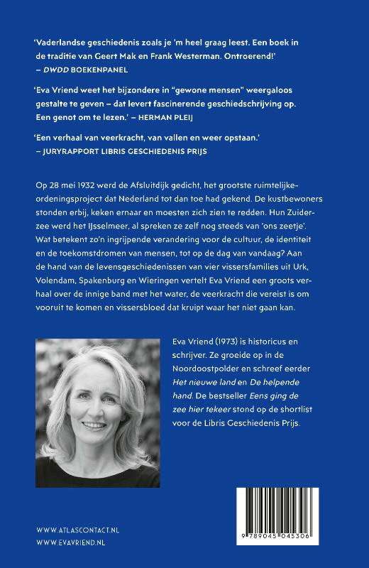 In ‘Eens ging de zee hier tekeer’ vertelt Eva Vriend de geschiedenis van de Zuiderzee en IJsselmeer. Op 28 mei 1932 werd de Afsluitdijk gedicht. De kustbewoners stonden erbij, keken ernaar en moesten zich zien te redden. Wat betekent zo’n ingrijpende verandering voor de cultuur, de identiteit en de toekomstdromen van mensen, tot op de dag van vandaag? Aan de hand van de levensgeschiedenissen van vier vissersfamilies uit Urk, Volendam, Spakenburg en Wieringen vertelt Eva Vriend een groots verhaal over de innige band met het water, de veerkracht die vereist is om vooruit te komen en vissersbloed dat kruipt waar het niet gaan kan. Volgens het DWDD Boekenpanel is dit ‘een ontroerend boek in de traditie van Geert Mak en Frank Westerman’.