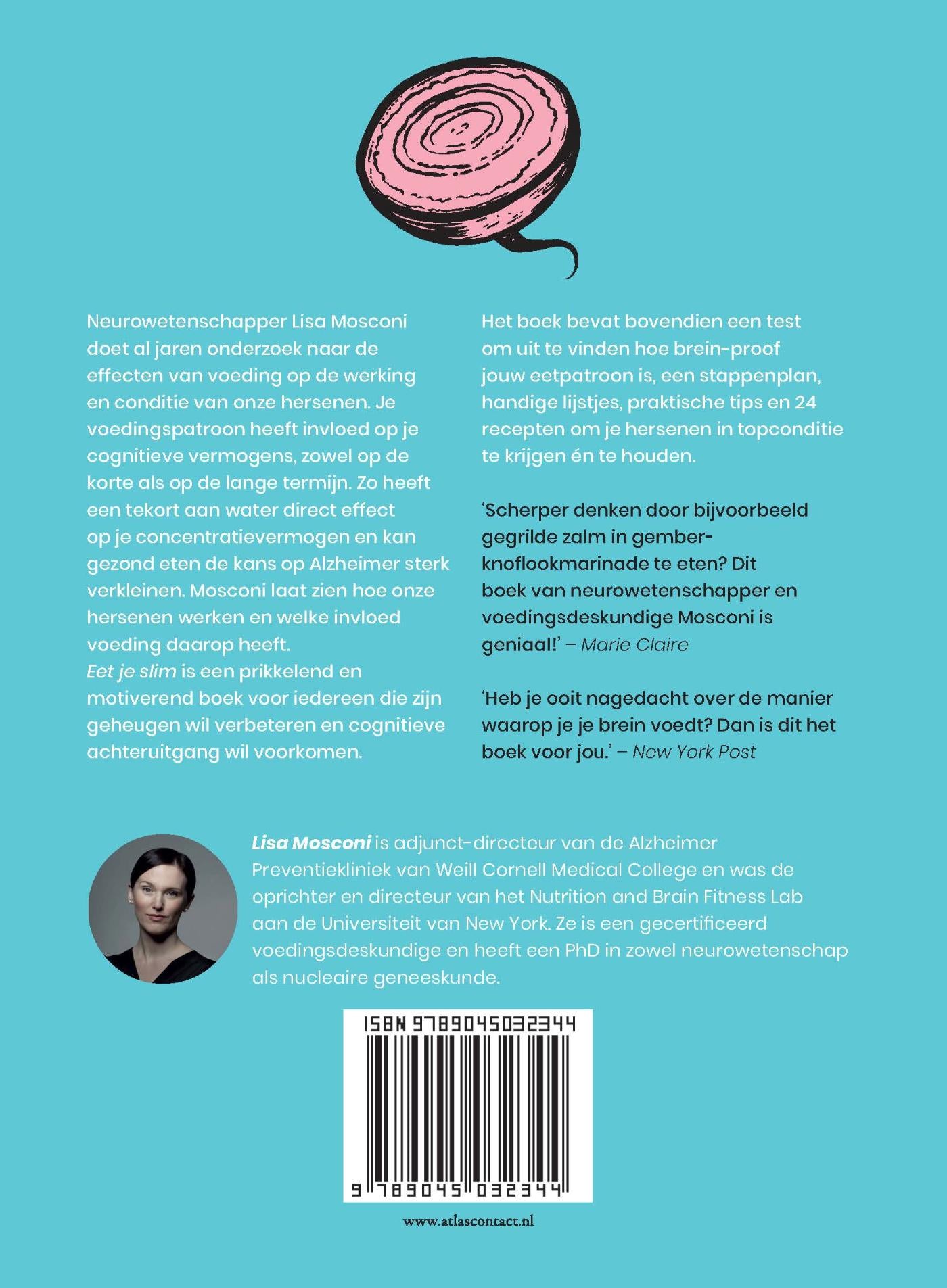 In ‘Eet je slim’ vertelt neurowetenschapper Lisa Mosconi, die al jaren onderzoek doet naar de effecten van voeding op de werking en conditie van onze hersenen, hoe je voedingspatroon invloed heeft op je cognitieve vermogens, zowel op de korte als op de lange termijn. Zo heeft een tekort aan water direct effect op je concentratievermogen en kan gezond eten de kans op Alzheimer sterk verkleinen. Mosconi laat zien hoe onze hersenen werken en welke invloed voeding daarop heeft.