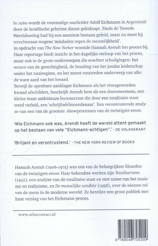 meest omstreden onderwerp van alle: het wezen van het kwaad. Terwijl de openbare aanklager Eichmann als het vleesgeworden kwaad afschildert, beschrijft Arendt hem als een doorsnee-mens, een kleine, maar ambitieuze