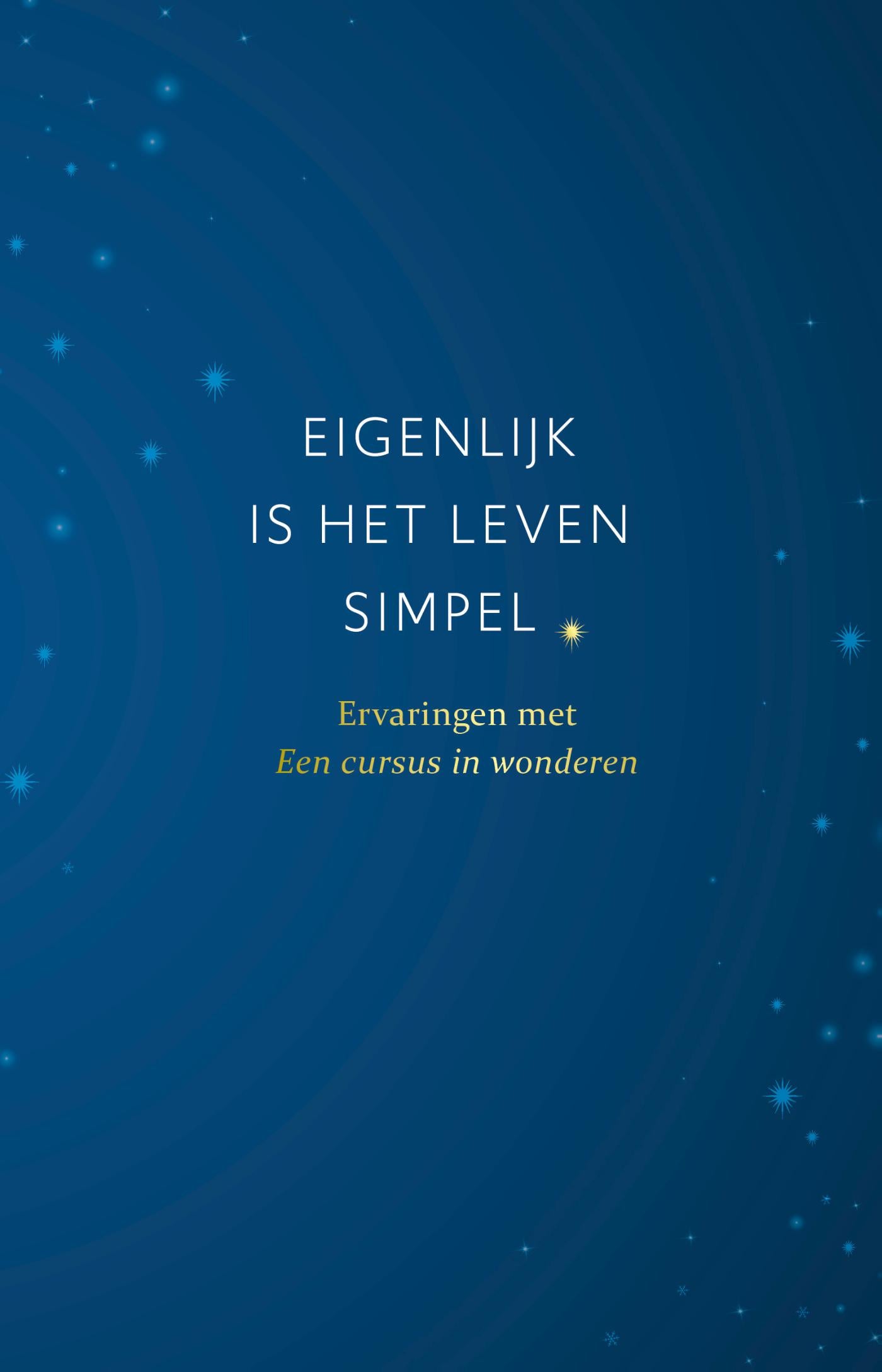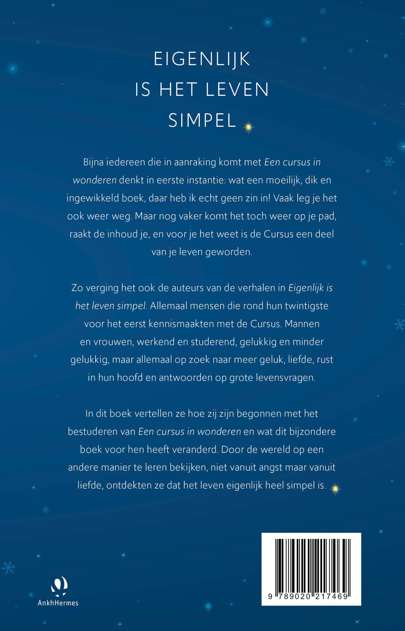 Een cursus in wonderen is een dik, donkerblauw boek. Je kunt je leven lang student zijn van de Cursus. In Eigenlijk is het leven simpel delen jongeren hoe de Cursus hun leven heeft veranderd. Zij vertellen hoe zij zijn begonnen met het bestuderen van een boek dat in eerste instantie weerstand oproept, maar op den duur bijzondere lessen bevat voor wie zich open durft te stellen. De ervaringen gaan in op onderwerpen zoals niet-oordelen en vergeving in het leven van jongeren.