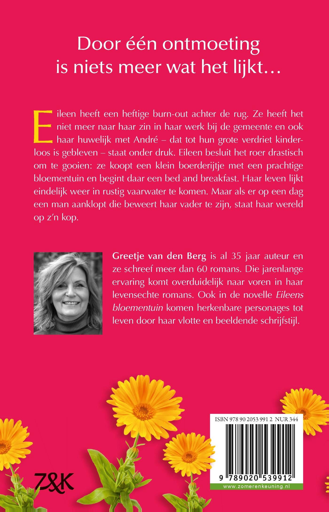 Eileens bloementuin' van Greetje van den Berg is een meeslepend verhaal over de kinderloze Eileen. Na een burn-out besluit ze het roer drastisch om te gooien. Ze koopt een boerderij en begint daar een bed and breakfast. Als daar op een dag een man aanklopt die beweert haar vader te zijn, staat haar leven op z'n kop. Niets is wat het lijkt.