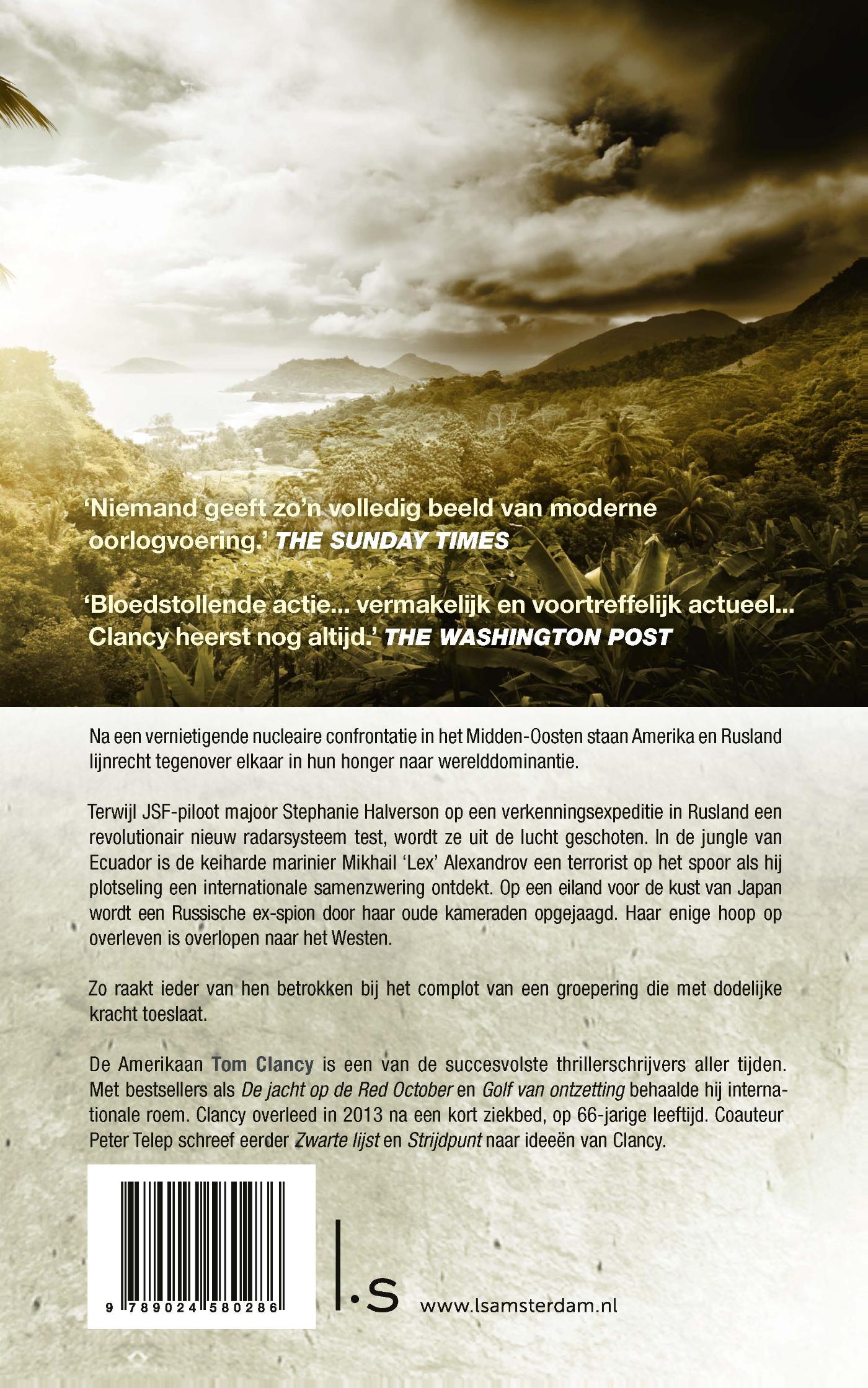De Amerikaan Tom Clancy is een van de succesvolste thrillerschrijvers aller tijden. Met bestsellers als De jacht op de Red October en Golf van ontzetting behaalde hij internationale roem. Clancy overleed in 2013 na een kort ziekbed, op 66-jarige leeftijd. Coauteur Peter Telep schreef eerder Zwarte lijst en Strijdpunt naar een idee van Clancy.