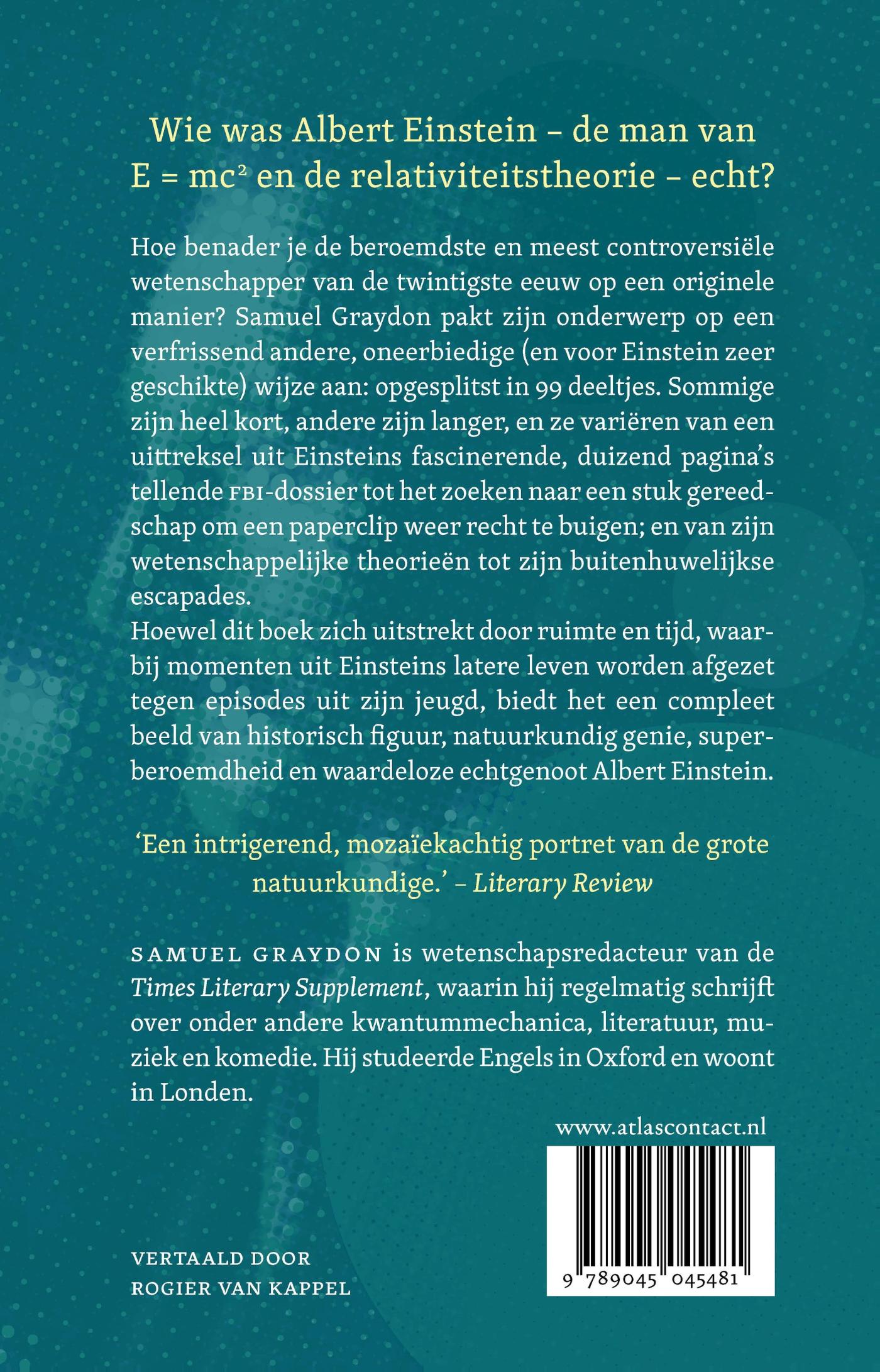 Hoe benader je de beroemdste en meest controversiële wetenschapper van de twintigste eeuw op een originele manier? Samuel Graydon pakt zijn onderwerp op een verfrissend andere, oneerbiedige (en voor Einstein zeer geschikte) wijze aan: opgehakt in 99 deeltjes. Sommige zijn heel kort, andere zijn langer, en ze variëren van een uittreksel uit Einsteins fascinerende, duizend pagina’s tellende FBI-dossier tot het zoeken naar een stuk gereedschap om een paperclip weer recht te buigen; en van zijn wetenschappelijke theorieën tot zijn buitenhuwelijkse escapades.