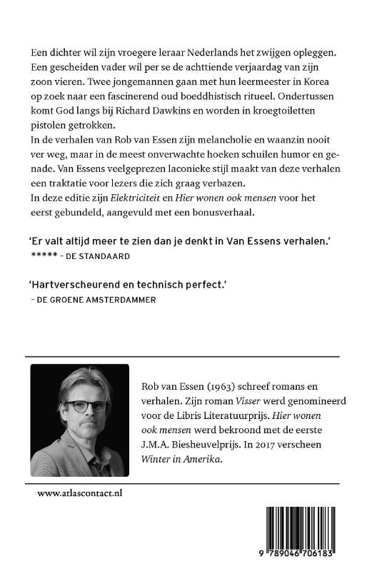 Een dichter wil zijn vroegere leraar Nederlands het zwijgen opleggen; een gescheiden vader wil per se de achttiende verjaardag van zijn zoon vieren; twee jongemannen gaan met hun leermeester in Korea op zoek naar een fascinerend oud boeddhistisch ritueel. Ondertussen komt God langs bij Richard Dawkins en worden in kroegtoiletten pistolen getrokken. In de verhalen van Rob van Essen zijn melancholie en waanzin nooit ver weg, maar in de meest onverwachte hoeken schuilt humor en genade. Van Essens veelgeprezen laconieke stijl maakt deze verhalen een traktatie voor lezers die zich graag verbazen. In deze editie zijn Elektriciteit en Hier wonen ook mensen voor het eerst gebundeld, aangevuld met een bonusverhaal.