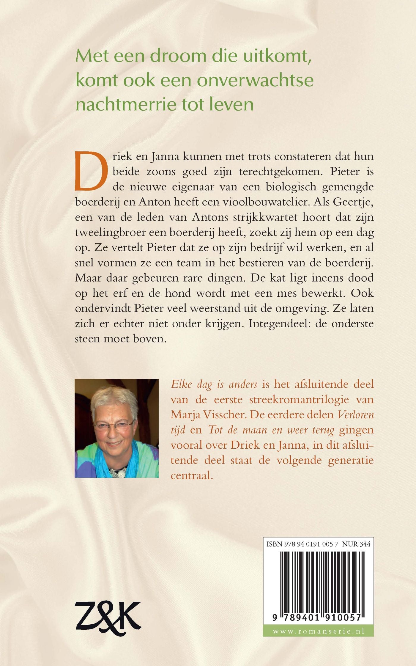 Driek en Janna zijn in ‘Elke dag is anders’ van Marja Visscher trots dat hun zoons goed zijn terechtgekomen. Pieter is eigenaar van een boerderij en Anton heeft een vioolbouwatelier. Als Geertje, een van de leden van Antons strijkkwartet, hoort dat zijn tweelingbroer een boerderij heeft, zoekt ze hem op. Ze vertelt hem dat ze op zijn bedrijf wil werken. Al snel vormen ze een team in het bestieren van de boerderij. Maar daar gebeuren rare dingen. ‘Elke dag is anders’ is het afsluitende deel in een trilogie van Marja Visscher, na ‘Verloren tijd’ en ‘Tot de maan en weer terug’.