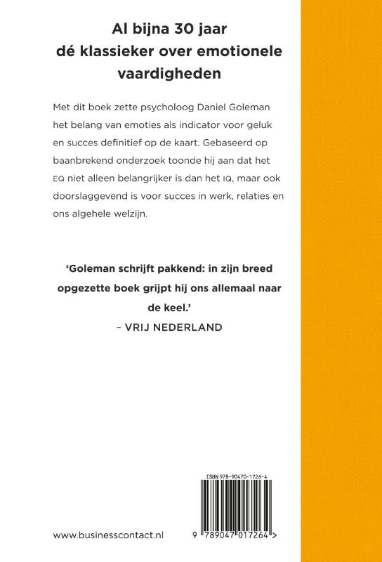 Daniel Goleman laat je kennismaken met het voelende deel van ons brein, dat zorgt voor zelfkennis, zelfbeheersing, geestdrift, het vermogen eigen emoties te herkennen en onszelf te motiveren. Emotionele vaardigheden blijken niet alleen belangrijker te zijn dan rationele, ze zijn ook van doorslaggevend belang voor succes in werk en relaties en voor ons lichamelijk welbevinden.