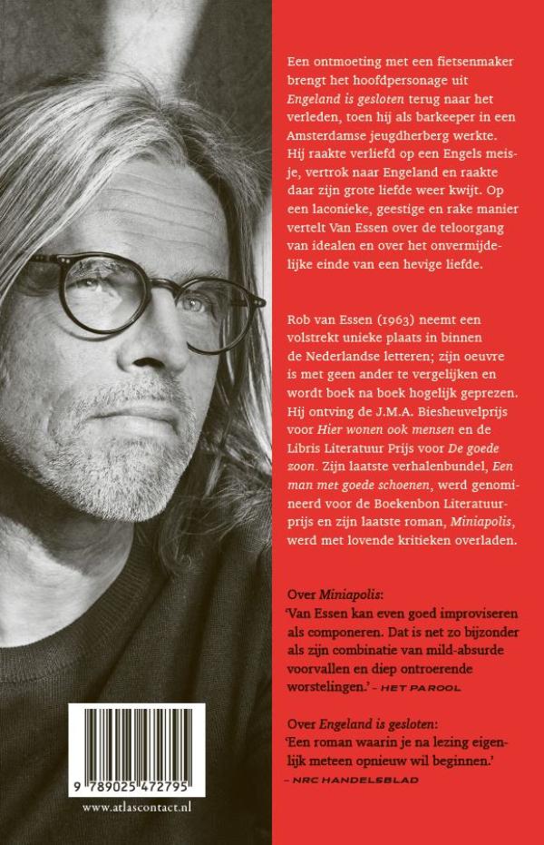 In ‘Engeland is gesloten’ van Rob van Essen brengt een ontmoeting met een fietsenmaker het hoofdpersonage terug naar het verleden, toen hij als barkeeper in een Amsterdamse jeugdherberg werkte. Hij raakte verliefd op een Engels meisje, vertrok naar Engeland en raakte daar zijn grote liefde weer kwijt. Op een laconieke, geestige en rake manier vertelt Van Essen over de teloorgang van idealen en over het onvermijdelijke einde van een hevige liefde.