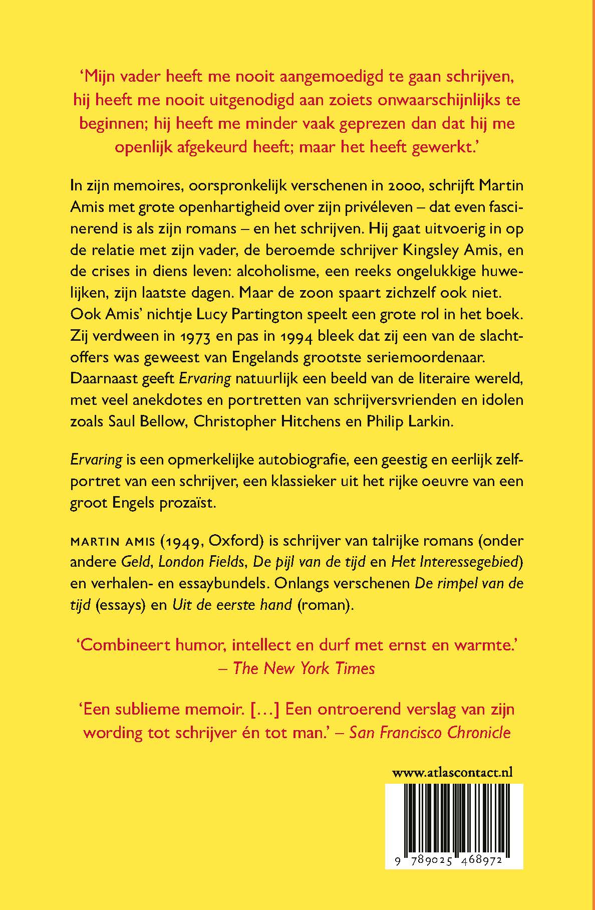 In zijn memoires ‘Ervaring’ schrijft Martin Amis met grote openhartigheid over zijn privéleven – dat even fascinerend is als zijn romans – en het schrijven. Hij gaat uitvoerig in op de relatie met zijn vader, de beroemde schrijver Kingsley Amis, en de crises in diens leven: alcoholisme, een reeks ongelukkige huwelijken, zijn laatste dagen. Maar de zoon spaart zichzelf ook niet.