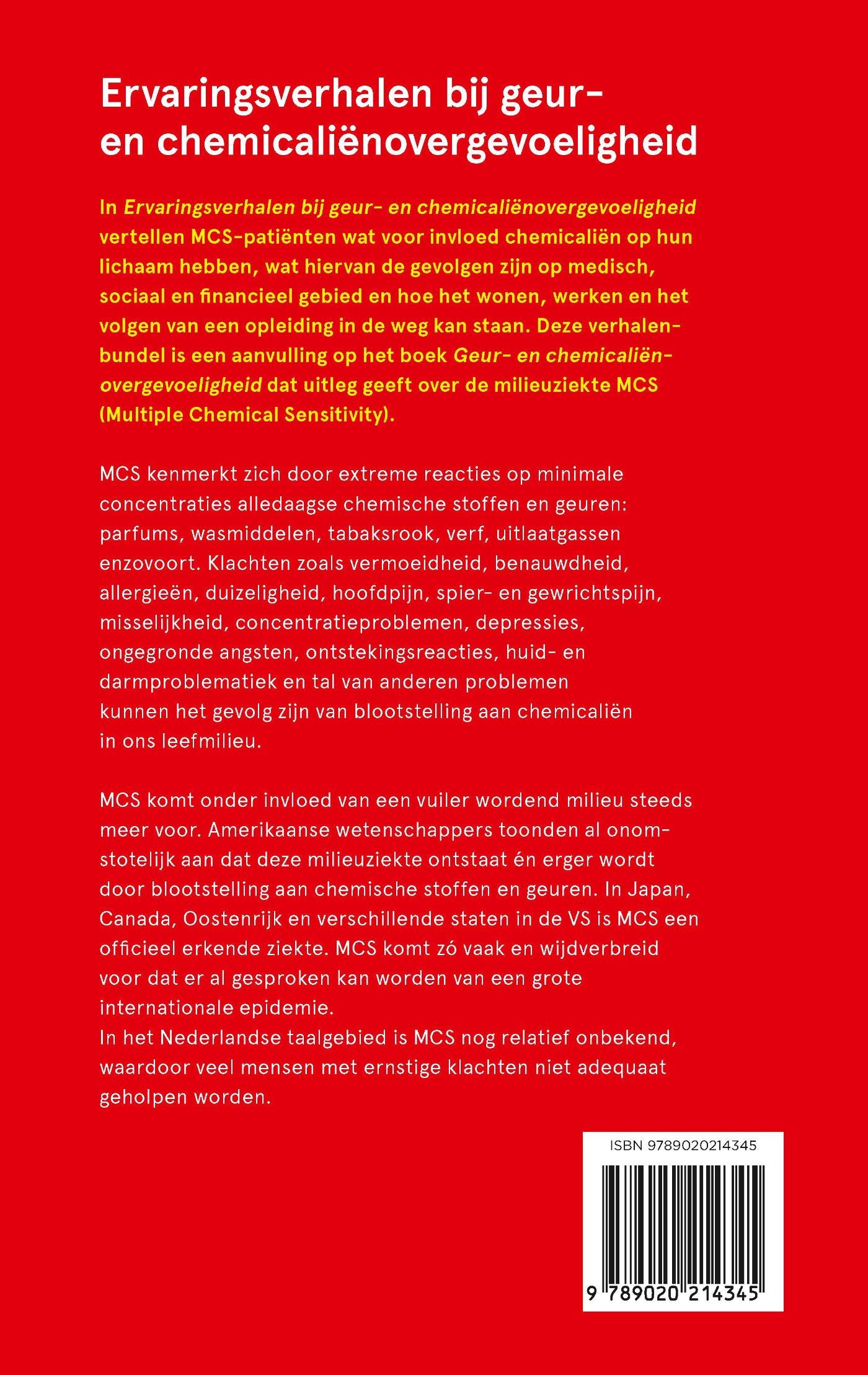 In Ervaringsverhalen bij geur- en chemicaliënovergevoeligheid vertellen MCS-patiënten wat voor invloed chemicaliën op hun lichaam hebben, wat hiervan de gevolgen zijn op medisch, sociaal en financieel gebied en hoe het wonen, werken en het volgen van een opleiding in de weg kan staan. Deze verhalenbundel is een aanvulling op het boek Geur- en chemicaliënovergevoeligheid dat uitleg geeft over de milieuziekte MCS (Multiple Chemical Sensitivity).