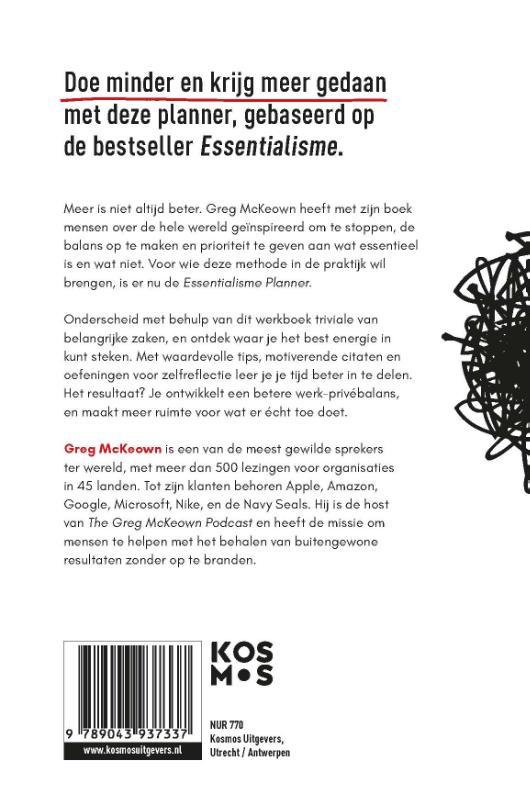 Met de 'Essentialisme Planner' van Greg McKeown kun je de kracht van essentialisme in de praktijk brengen. Zijn boek 'Essentialisme' heeft al honderdduizenden levens veranderd, en met de praktische opdrachten uit deze planner, krijg ook jij de tools om je leven effectiever en bewuster in te richten. Dit werkboek helpt je om triviale zaken van belangrijke doelen te onderscheiden, zodat je je energie gericht inzet op wat écht waardevol is. Door je tijd effectiever in te delen ontstaat er een betere werk-privébalans.