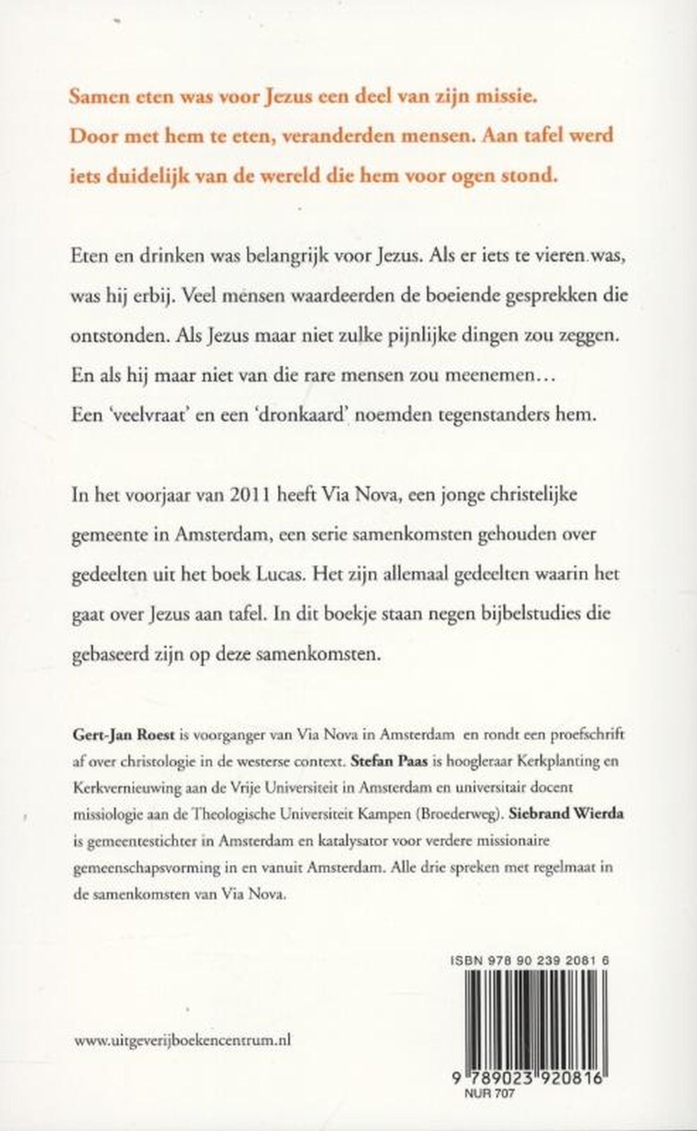 Eten en drinken was belangrijk voor Jezus. Als er iets te vieren was, was hij erbij. Veel mensen waardeerden de boeiende gesprekken die ontstonden. Als Jezus maar niet zulke pijnlijke dingen zou zeggen. En als hij maar niet van die rare mensen zou mee-nemen Een `veelvraat en een `dronkaard noemden tegenstanders hem. In het voorjaar van 2011 heeft Via Nova, een jonge christelijke gemeente in Amsterdam, een serie samenkomsten gehouden over gedeelten uit het boek Lucas. Het zijn allemaal gedeelten waarin het gaat over Jezus aan tafel. In dit boekje staan negen bijbelstudies die gebaseerd zijn op deze samenkomsten.