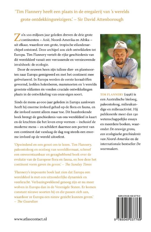 Tim Flannery brengt in zijn baanbrekende boek Europa de geschiedenis van ons werelddeel in kaart en de krachten die het leven erop vormen – inclusief de moderne mens – en schildert daarmee een portret van een continent dat vandaag de dag nog steeds een enorme invloed op de wereld uitoefent. Zo’n 100 miljoen jaar geleden dreven de drie grote continenten – Azië, Noord-Amerika en Afrika – uit elkaar, waardoor een grote, tropische eilandenarchipel ontstond. Deze archipel zou zich ontwikkelen tot Europa. Flannery vertelt de rijke geschiedenis van dit werelddeel vanuit een verrassende en vernieuwende invalshoek: de ecologie. Door de eeuwen heen zijn talloze dier- en plantsoorten naar Europa gemigreerd en met het continent mee geëvolueerd. In Europa werden de eerste koraalriffen gevormd, leefden holenberen, mammoeten en ’s werelds grootste olifanten én vonden cruciale ontwikkelingen plaats in de ontwikkeling van onze eigen soort. Sinds de mens 40 000 jaar geleden in Europa aankwam heeft hij enorme invloed gehad op de flora en fauna, en die invloed neemt alleen maar toe.