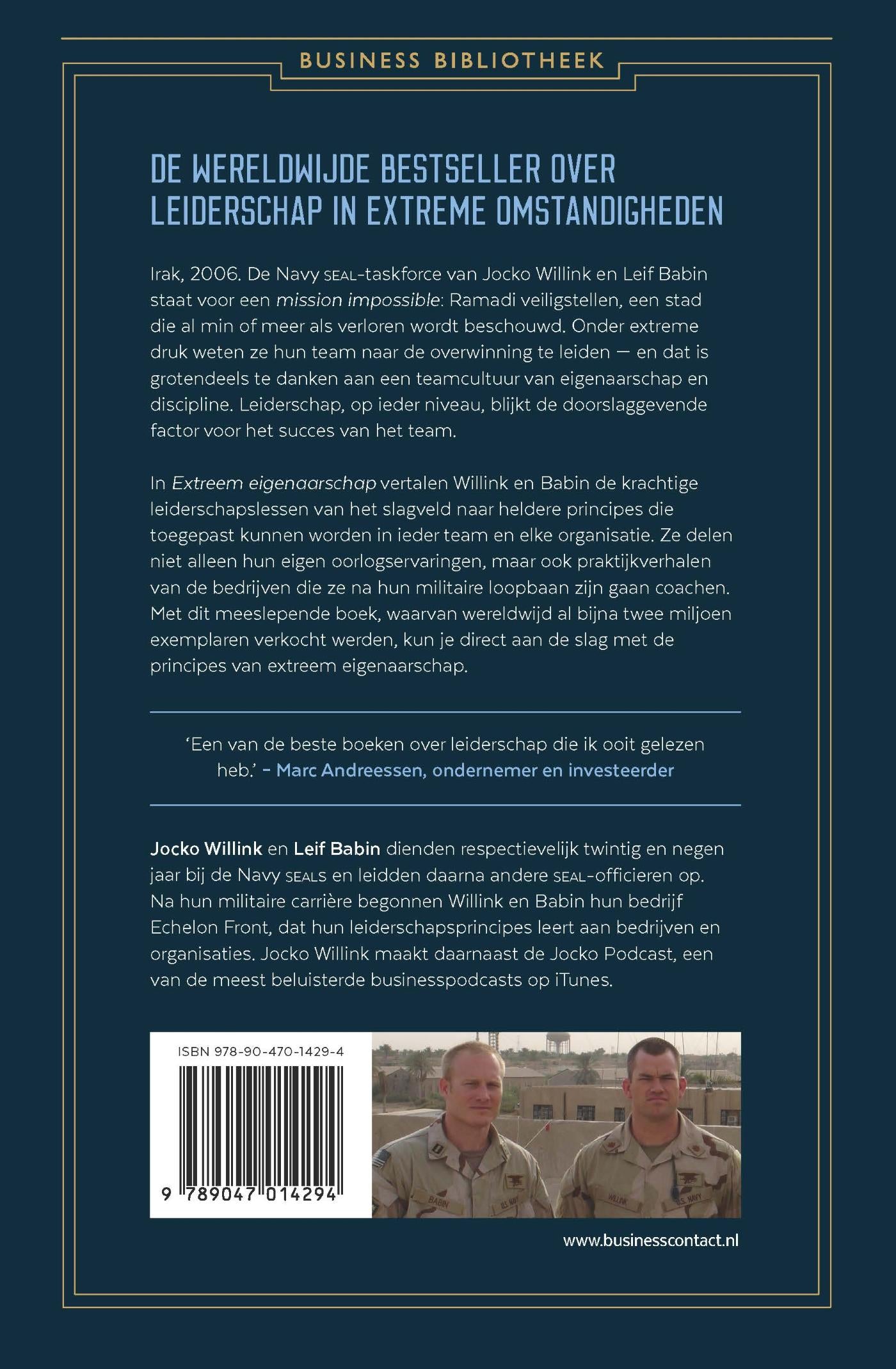 In ‘Extreem eigenaarschap’ delen ze niet alleen hun eigen oorlogservaringen, maar ook praktijkverhalen van de bedrijven die ze na hun militaire loopbaan zijn gaan coachen. Met dit meeslepende boek, waarvan wereldwijd al bijna twee miljoen exemplaren verkocht werden, kun je direct aan de slag met de principes van extreem eigenaarschap.