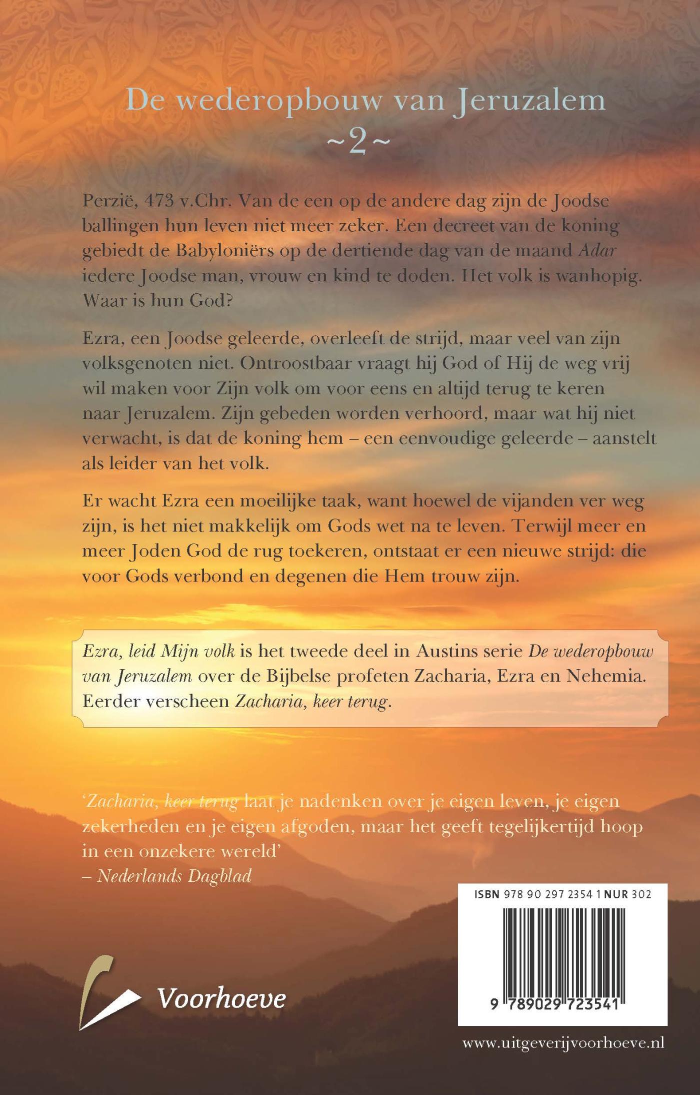 In de bijbels-historische roman `Ezra, leid Mijn volk brengt bestsellerauteur Lynn Austin de geloofsstrijd uit het Oude Testament weer tot leven. Van de een op andere dag zijn de Joodse ballingen hun leven niet meer zeker. Een decreet van de koning gebiedt de Babyloniërs om op de dertiende dag van Adar alle Joodse mannen, vrouwen en kinderen om te brengen. Ezra, een Joodse geleerde, wordt plotseling voor de taak gesteld om zijn wanhopige volk te leiden als het zich afvraagt wat de reden is voor deze ramp. Waar is hun God? Ezra overleeft de strijd, maar veel van zijn volksgenoten niet. Bedroefd vraagt hij God of Hij de weg vrij wil maken voor de ballingen om eens en voor altijd terug te keren naar Jeruzalem. Als zijn gebeden worden verhoord, en de laatste ballingen terugkeren om de aanbiddingsdienst in de tempel in ere te herstellen, ontdekt Ezra dat het ook in Jeruzalem nooit makkelijk is om Gods wet na te leven. Na al de jaren van ellende keren steeds meer Joden God nu de rug toe. Algauw ontspint zich een nieuwe strijd: de strijd voor Gods verbond en degenen die Hem trouw zijn. Lynn Austin wordt geroemd om haar historische en haar bijbels-historische romans. Eerder schreef ze onder andere series over de bijbelse koningen Hizkia en Manasse. `Ezra, leid Mijn volk is het tweede deel in de serie `De wederopbouw van Jeruzalem over de profeten Zacharia, Ezra en Nehemia.