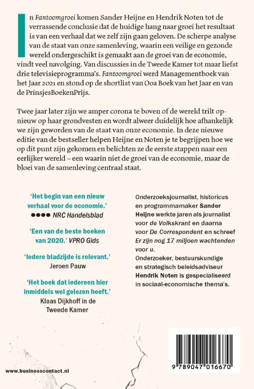 In ‘Fantoomgroei’ komen Sander Heijne en Hendrik Noten tot de verrassende conclusie dat de huidige hang naar groei het resultaat is van een verhaal dat we zelf zijn gaan geloven. De scherpe analyse van de staat van onze samenleving, waarin een veilige en gezonde wereld ondergeschikt is gemaakt aan de groei van de economie, vindt veel navolging. Van discussies in de Tweede Kamer tot maar liefst drie televisieprogramma’s. ‘Fantoomgroei’ werd Managementboek van het Jaar 2021 en stond op de shortlist van OOA Boek van het Jaar en van de PrinsjesBoekenPrijs.