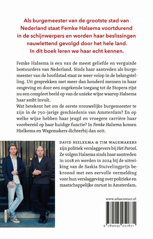 Femke Halsema is een van de meest geliefde en verguisde bestuurders van Nederland. Sinds haar aantreden als burgemeester van de hoofdstad staat ze weer volop in de belangstelling. Uit gesprekken met meer dan honderd mensen in haar omgeving en een ongekende toegang tot de Stopera rijst nu een nieuw beeld op van de eigenzinnige wijze waarop Halsema haar ambt invult. Wat betekent het om de eerste vrouwelijke burgemeester te zijn in de 750-jarige geschiedenis van Amsterdam? Hoe gaat ze te werk? Van de thriller rond haar benoeming en de coronaprotesten tot haar herbenoeming en de spanningen in de stad na 7 oktober 2023: in Femke Halsema komen Hielkema en Wagemakers dichterbij dan ooit.