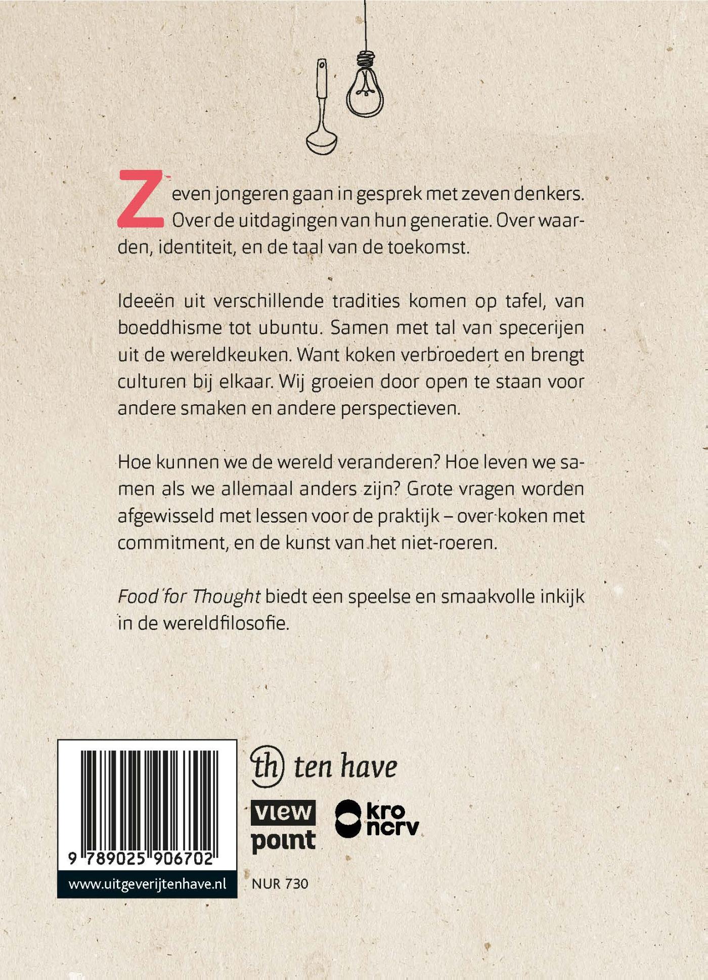 ‘Food for Thought’ is een filosofisch kookboek waarin wereldfilosofen een groep jonge mensen ontmoet en ze samen heerlijke gerechten verorberen en kauwen op de levensthema’s van de 21e eeuw: keuzestress, verbinding en eenzaamheid in een Facebook-tijdperk en trouw blijven aan jezelf. Samen eten is elkaar ontmoeten, en geeft voeding aan gesprekken en gedachtewisselingen. De smartphones blijven van tafel en wat volgt is een aaneenschakeling van heldere vragen, ontboezemingen en inzichten voor iedereen die leeft in de wereld van nu. ‘Food for Thought’ zit boordevol ingrediënten voor een goed gesprek en is inclusief recepten die je tijdens dit gesprek kunt serveren.