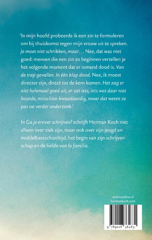 In Ga je erover schrijven? beschrijft Herman Koch hoe hij omgaat met zijn diagnose en blikt hij terug op ijkmomenten in zijn leven. Het is daarmee géén boek over ‘zijn strijd tegen kanker’, want hij besluit eigenlijk meteen al dat hij de kanker een zo beperkt mogelijke rol in zijn leven wil laten spelen. ‘Ja, ik zou doorleven, daar had de kanker vast niet op gerekend. Ik zou mijn eigen tegelwijsheid, “Nietsdoen is de kortste weg naar geluk”, in de praktijk brengen. Ik zou niets doen.’