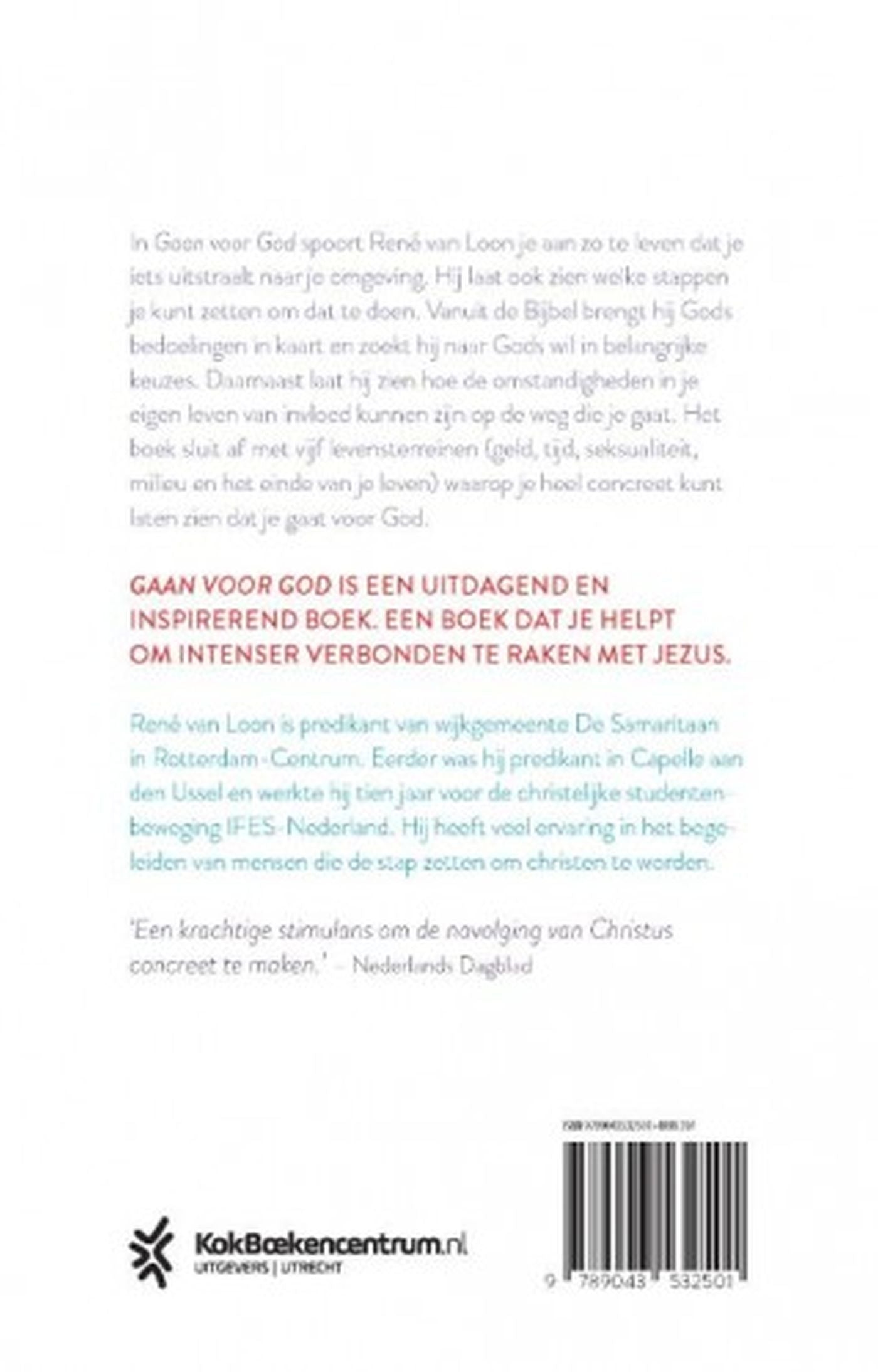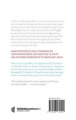 Gaan voor God van René van Loon is een uitdagend en inspirerend boek dat helpt om intenser verbonden te raken met Jezus. René van Loon spoort christenen aan zo te leven dat ze iets uitstralen naar hun omgeving. Hij laat ook zien welke stappen je kunt zetten om dat te doen. Vanuit de Bijbel brengt hij Gods bedoelingen in kaart en zoekt hij naar Gods wil in belangrijke keuzes. Daarnaast laat hij zien hoe de omstandigheden in je eigen leven van invloed kunnen zijn op de weg die je gaat. Het boek sluit af met vijf levensterreinen (geld, tijd, seksualiteit, milieu en het einde van je leven) waarop je heel concreet kunt laten zien dat je gaat voor God.