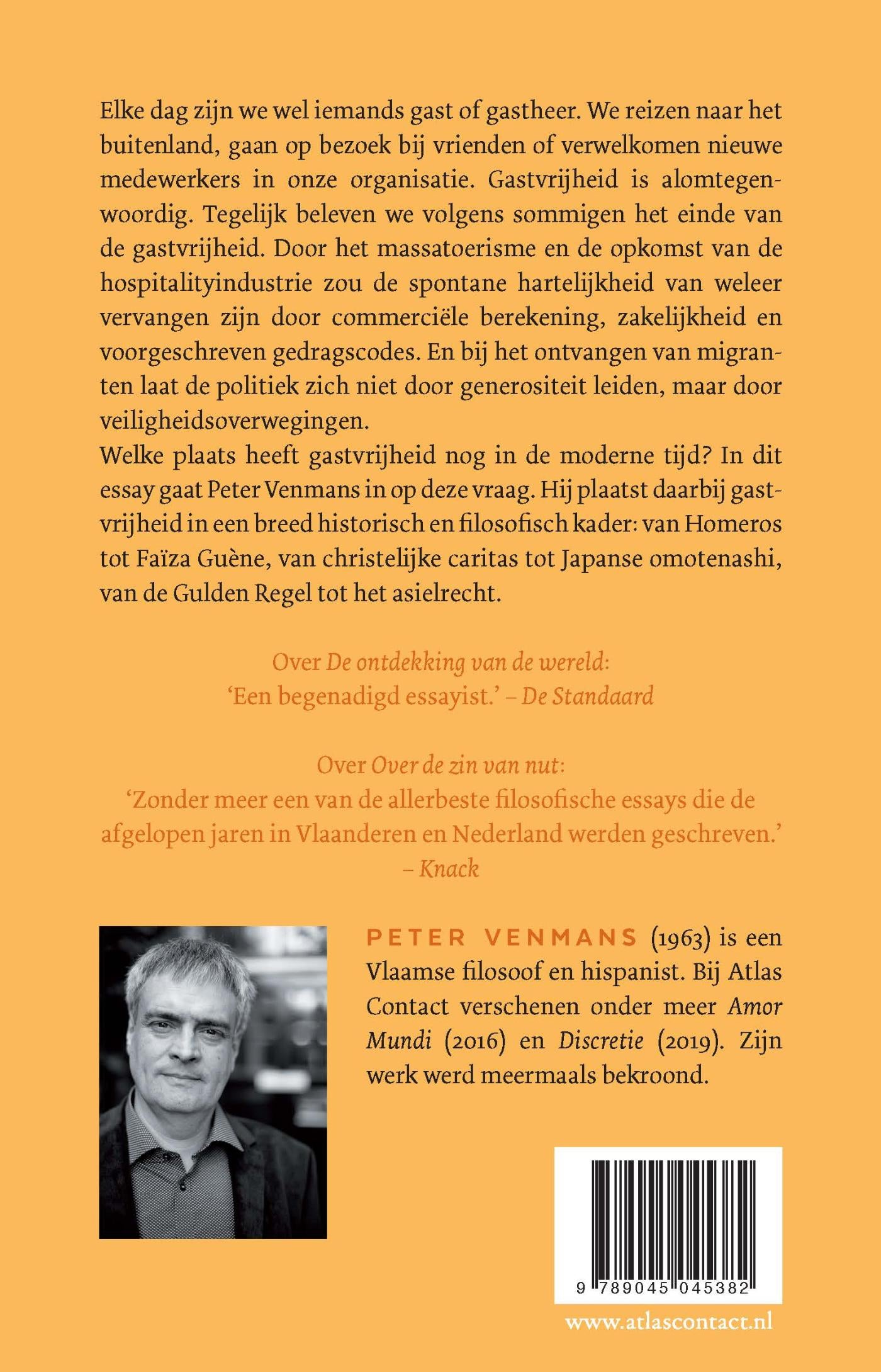 In dit essay gaat Peter Venmans in op deze vraag en plaatst daarbij gastvrijheid in een breed historisch en filosofisch kader: van Homeros tot Faïza Guène, van christelijke caritas tot Japanse omotenashi, van de Gulden Regel tot het asielrecht.
