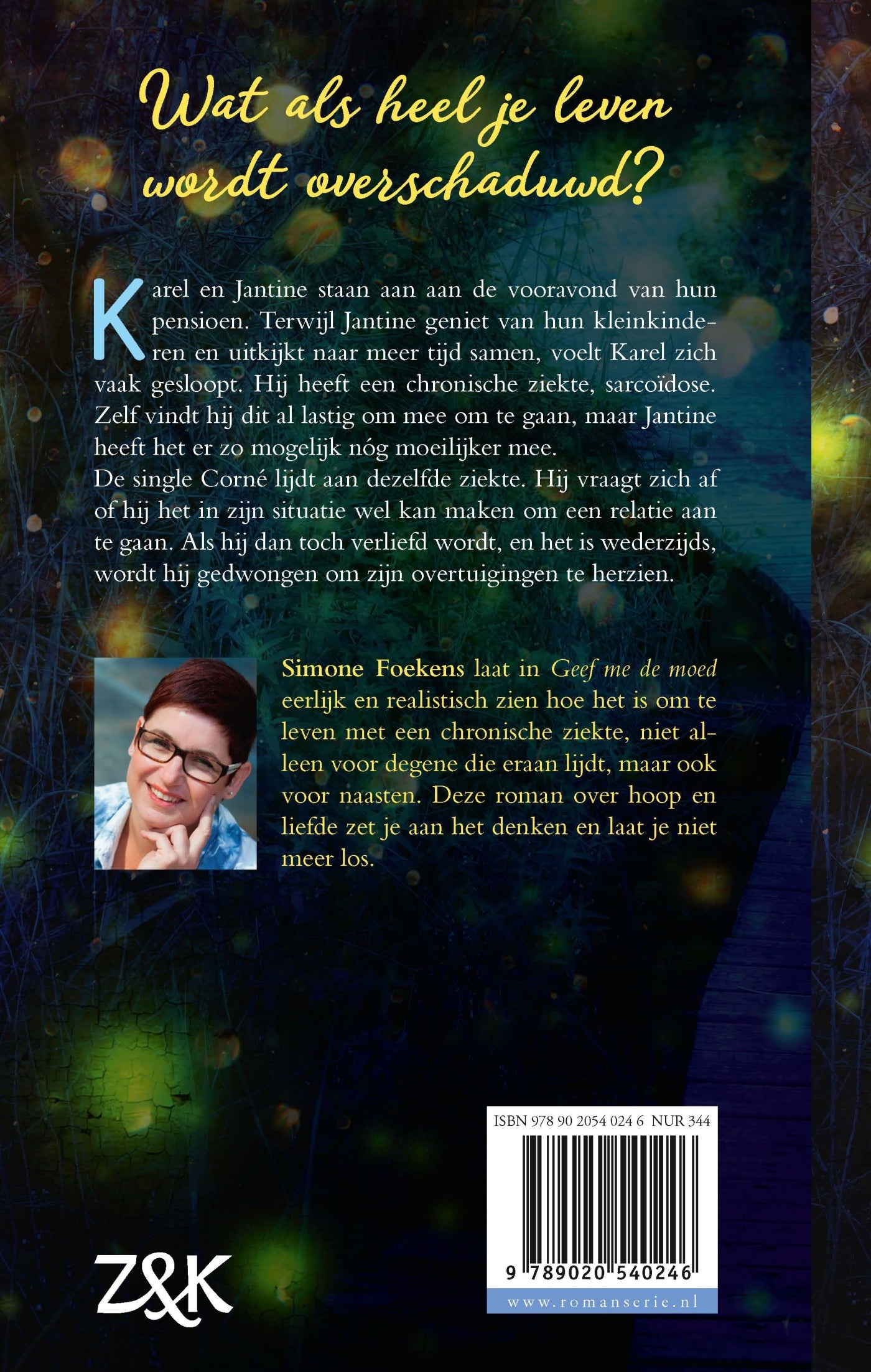In ‘Geef me de moed’ van Simone Foekens staan Jantine en Karel aan de vooravond van hun pensioen. Waar Jantine geniet van hun kleinkinderen en uitkijkt naar meer tijd samen, voelt Karel zich vaak gesloopt. Hij heeft een chronische ziekte, sarcoïdose. Zelf vindt hij dit lastig om mee om te gaan, maar Jantine heeft het er mogelijk nóg moeilijker mee.