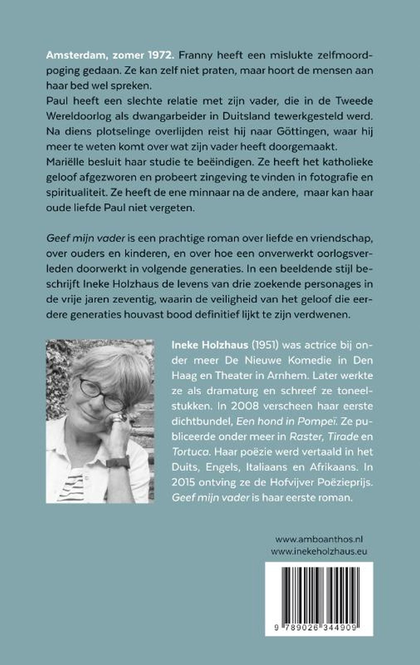 Geef mijn vader van Ineke Holzhaus is een prachtig verhaal over liefde en vriendschap, over ouders en kinderen, en over hoe een onverwerkt oorlogsverleden doorwerkt in volgende generaties. Dichter Ineke Holzhaus beschrijft de levens van drie zoekende personages in de vrije jaren zeventig, waarin de veiligheid van het geloof die eerdere generaties houvast bood definitief lijkt te zijn verdwenen.