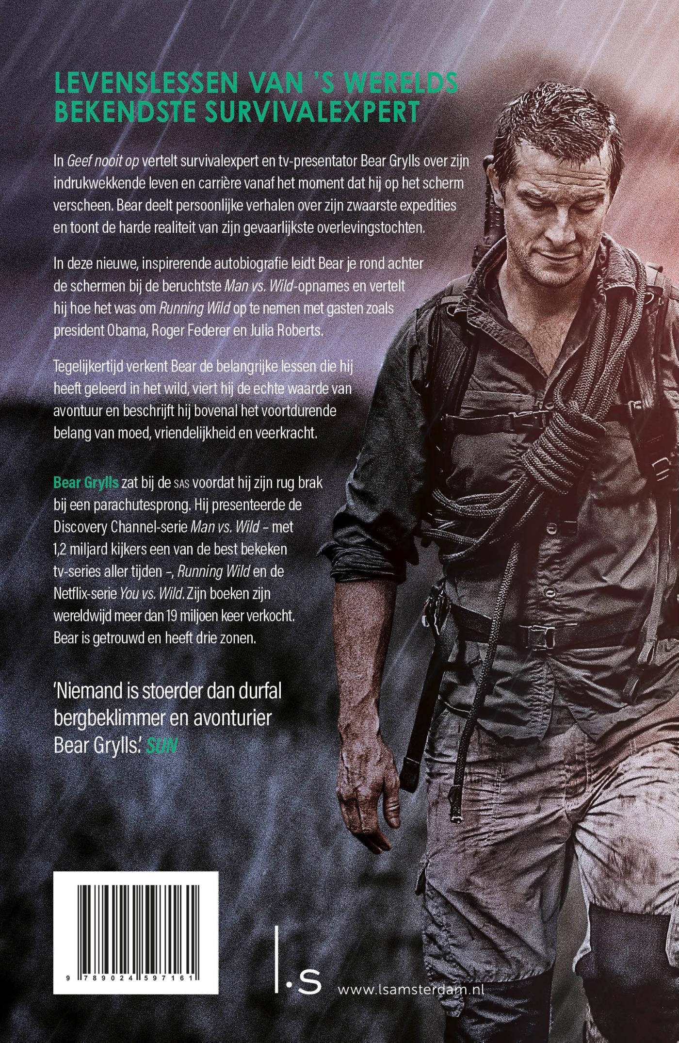 Geef nooit op is de nieuwe autobiografie van avonturier Bear Grylls en het vervolg op zijn succesvolle boek Modder, zweet en tranen. Bear Grylls is bekend van zijn razend populaire tv-series op Netflix en National Geographic, waarmee hij miljoenen kijkers trekt.
