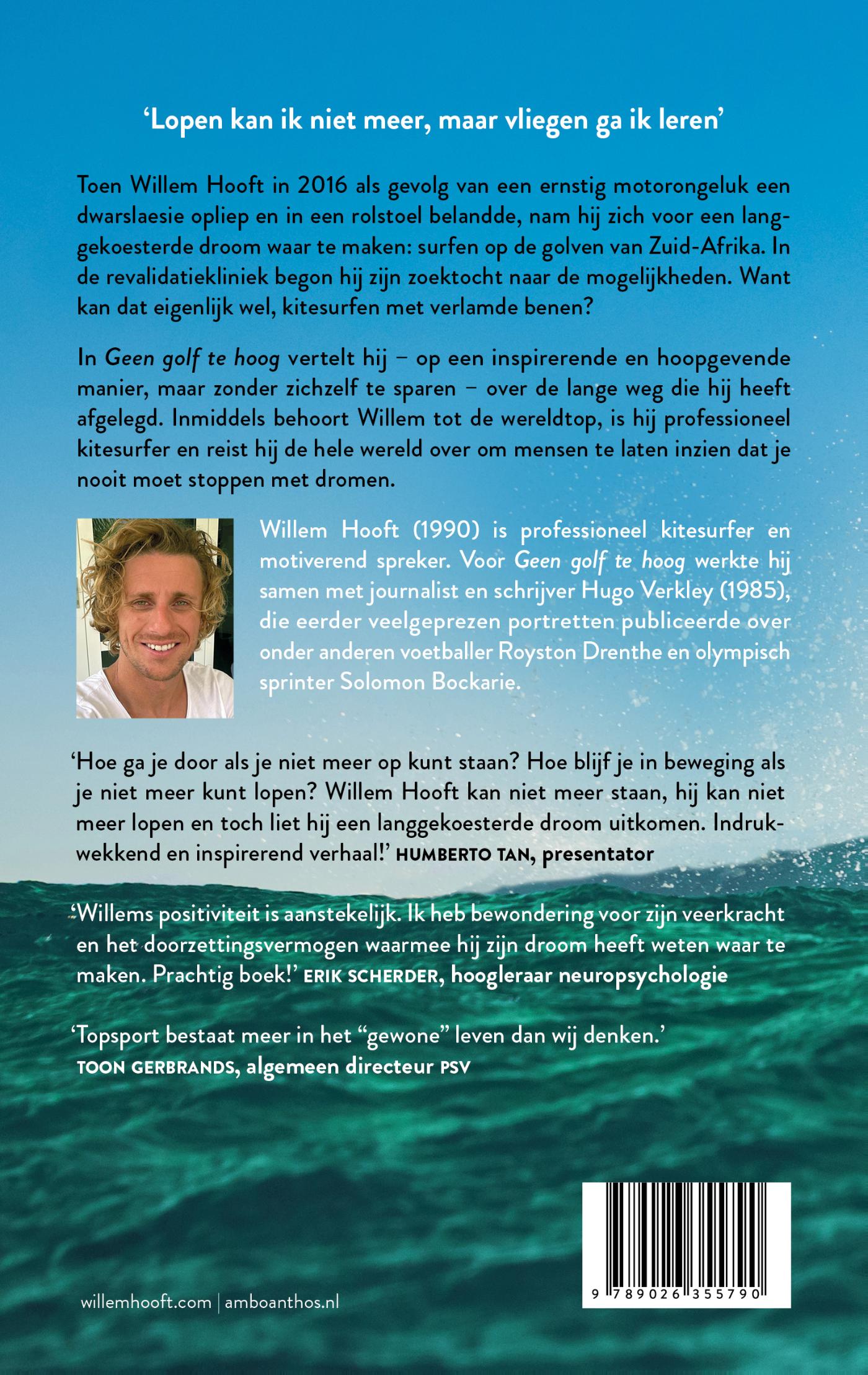 In Geen golf te hoog vertelt hij – op een inspirerende en hoopgevende manier, maar zonder zichzelf te sparen – over de lange weg die hij heeft afgelegd. Inmiddels behoort Willem tot de wereldtop, is hij professioneel kitesurfer en reist hij de hele wereld over om mensen te laten inzien dat je nooit moet stoppen met dromen.