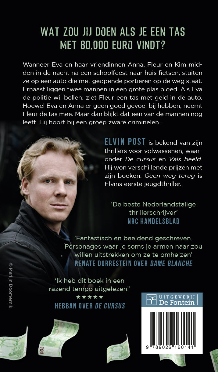 Wat zou jij doen als je een tas met 80.000 euro vindt? In Geen weg terug komen vier vriendinnen voor dit dilemma te staan. Een spannende jeugdthriller van bekroond auteur Elvin Post.