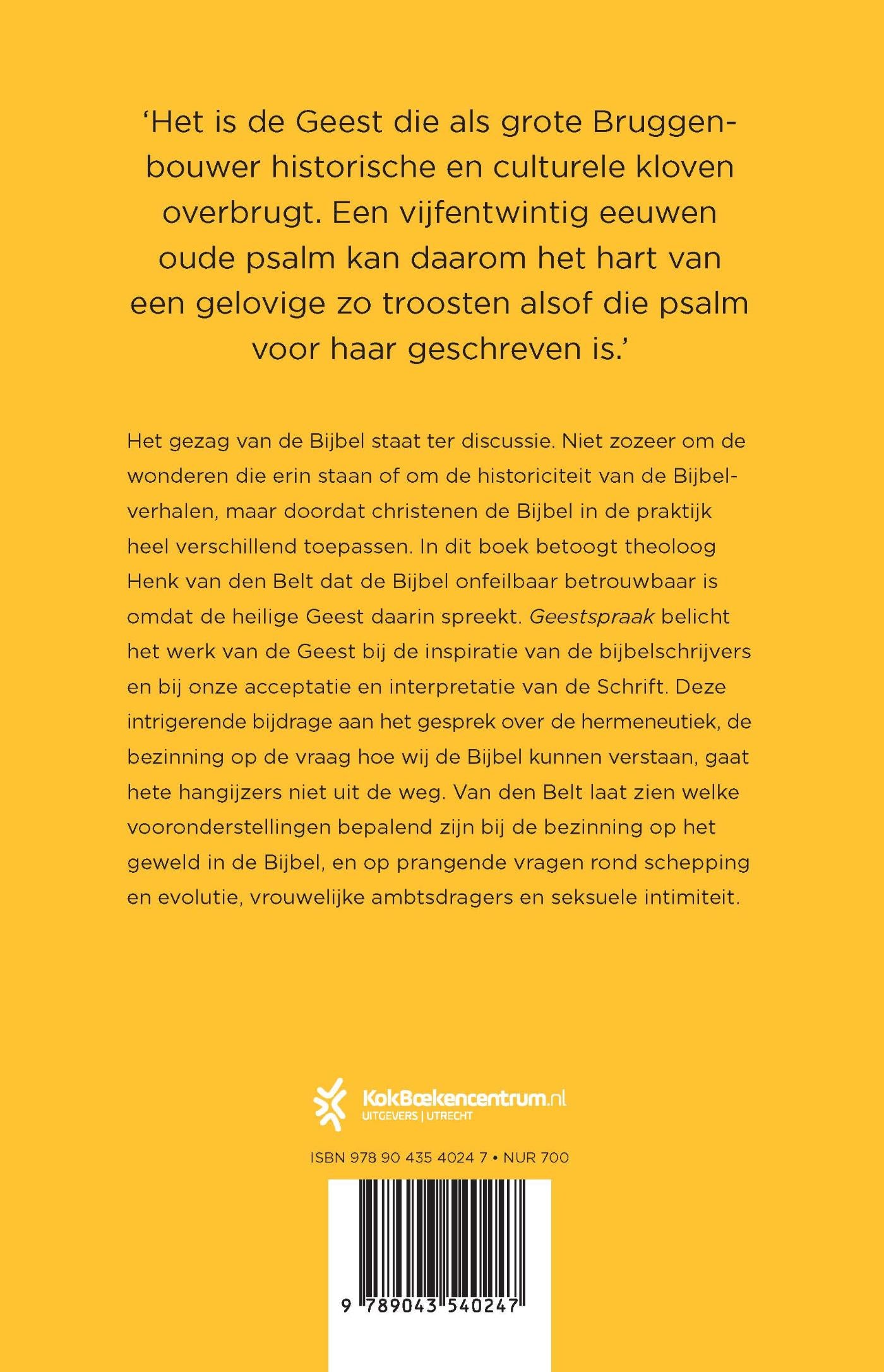In Geestspraak betoogt theoloog Henk van den Belt dat de Bijbel onfeilbaar betrouwbaar is omdat de heilige Geest daarin spreekt. Het gezag van de Bijbel geeft al lange tijd aanleiding tot discussie. Niet zozeer om de wonderen die erin staan of om de historiciteit van de bijbelverhalen, maar doordat christenen de Bijbel in de praktijk heel verschillend toepassen. Dit boek belicht hoe de Geest werkt bij de inspiratie van de bijbelschrijvers, hoe Hij zorgt voor de acceptatie van de Schrift en hoe Hij ons leidt bij de interpretatie. Het is een intrigerende bijdrage aan het gesprek over de hermeneutiek, aan de bezinning op de vraag hoe wij de Bijbel verstaan.