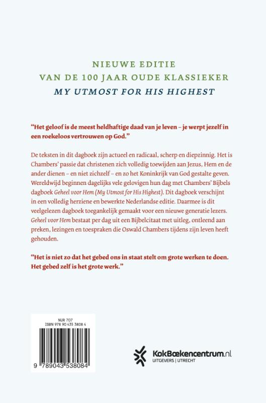 De teksten in dit dagboek zijn actueel en radicaal, scherp en diepzinnig. Het is Chambers’ passie dat christenen zich volledig toewijden aan Jezus, Hem en de ander dienen – en niet zichzelf – en zo het Koninkrijk van God gestalte geven. Wereldwijd beginnen dagelijks vele gelovigen hun dag met Chambers’ Bijbels dagboek Geheel voor Hem (My Utmost for His Highest). Dit dagboek verschijnt in een volledig herziene en bewerkte Nederlandse editie. Daarmee is dit veelgelezen dagboek toegankelijk gemaakt voor een nieuwe generatie lezers.