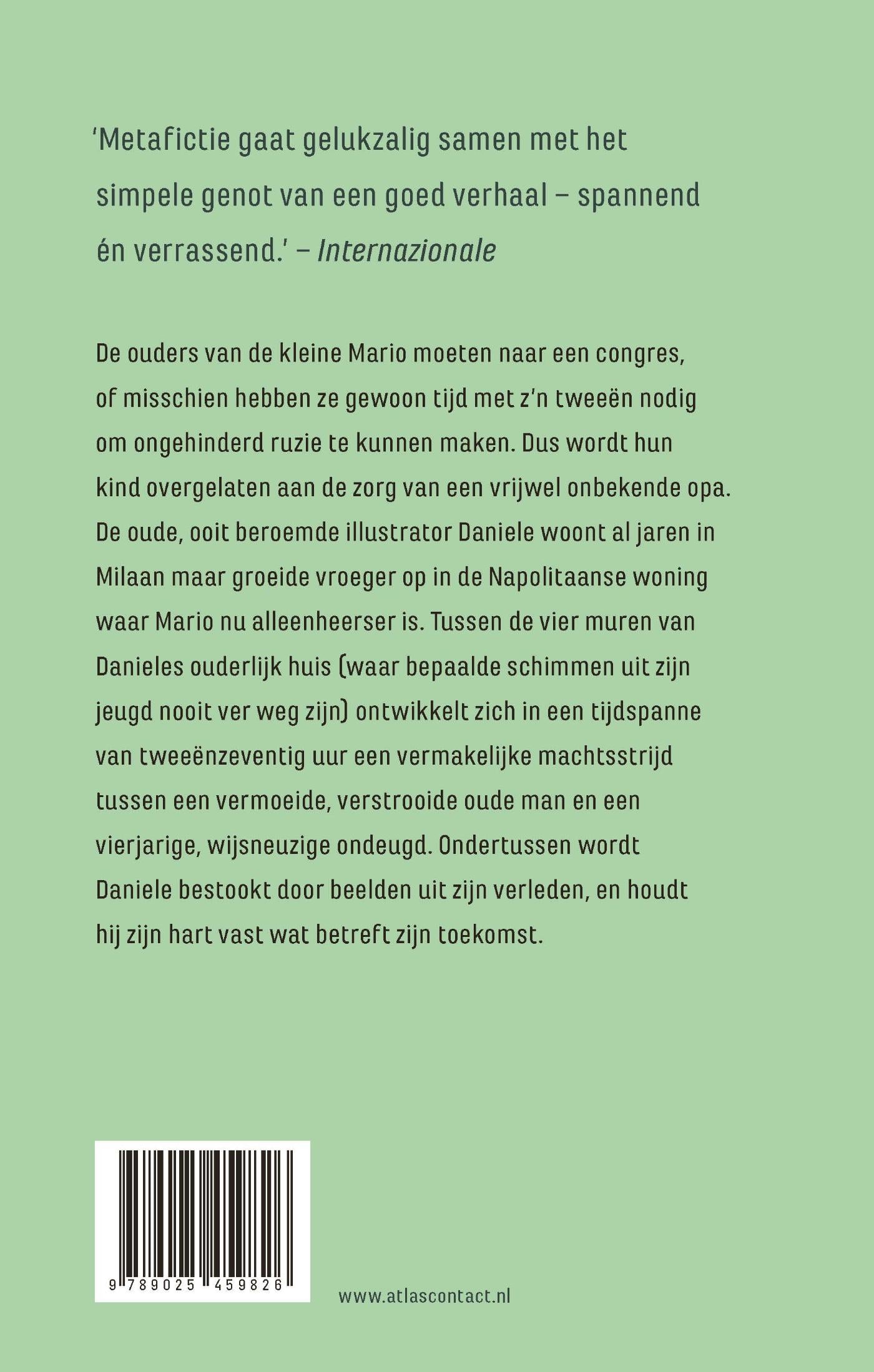 ‘Geintje’, de nieuwe roman van Domenico Starnone. De ouders van de kleine Mario moeten naar een congres, of misschien hebben ze gewoon tijd met z’n tweeën nodig om ongehinderd ruzie te kunnen maken. Dus wordt hun kind overgelaten aan de zorg van een vrijwel onbekende opa. De oude, ooit beroemde illustrator Daniele woont al jaren in Milaan maar groeide vroeger op in de Napolitaanse woning waar Mario nu alleenheerser is. Tussen de vier muren van Danieles ouderlijk huis (waar bepaalde schimmen uit zijn jeugd nooit ver weg zijn) ontwikkelt zich in een tijdspanne van tweeënzeventig uur een vermakelijke machtsstrijd tussen een vermoeide, verstrooide oude man en een vierjarige, wijsneuzige ondeugd. Ondertussen wordt Daniele bestookt door beelden uit zijn verleden, en houdt hij zijn hart vast wat betreft zijn toekomst.