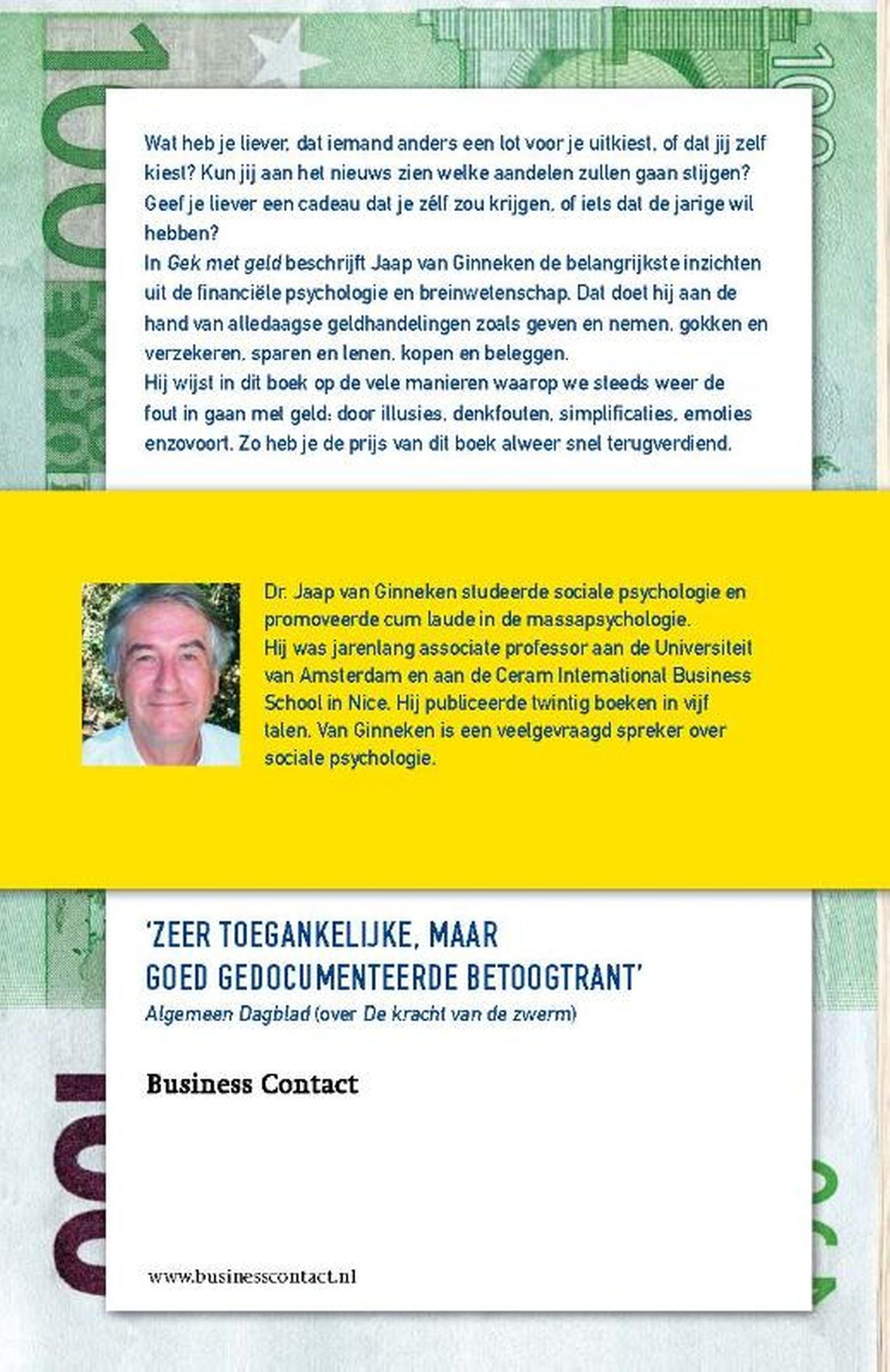 In Gek met geld beschrijft Jaap van Ginneken de belangrijkste inzichten uit de financiële psychologie en breinwetenschap. Dat doet hij aan de hand van alledaagse geldhandelingen zoals geven en nemen, gokken en verzekeren, sparen en lenen, kopen en beleggen. Hij wijst in dit boek op de vele manieren waarop we steeds weer de fout in gaan met geld: door illusies, denkfouten, simplificaties, emoties enzovoort. Zo heb je de prijs van dit boek alweer snel terugverdiend.