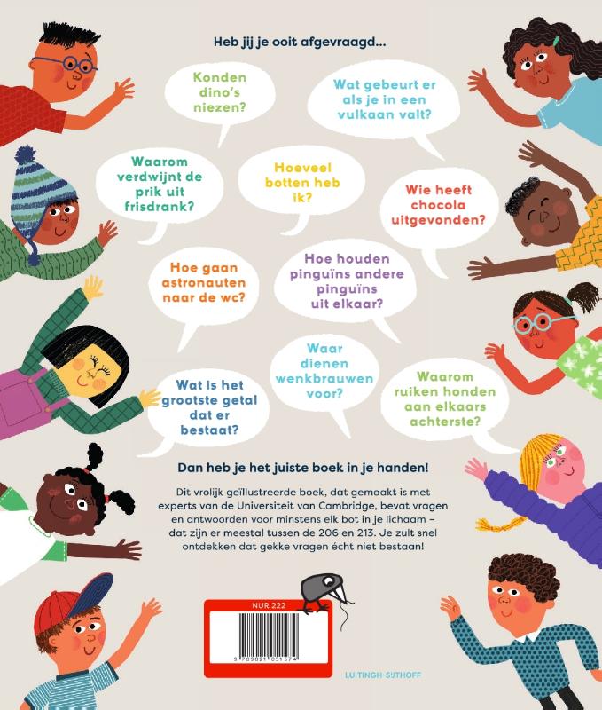 In dit boek vind je 213 vragen, voor elk bot in je lichaam minstens één (zo, weet je meteen hoeveel botten een mens heeft). Met de hulp van allerlei deskundigen geeft Mike Rampton antwoord op vragen als: moesten dino's ook niezen? Waarom houden mestkevers zo van poep? Wat doen dieren als ze een bril nodig hebben? Wie heeft onderbroeken uitgevonden? Hoe gingen ridders in harnassen naar de wc? Hoe hoog kunnen olifanten springen? Kortom: domme vragen bestaan niet, maar wel een heleboel gekke!