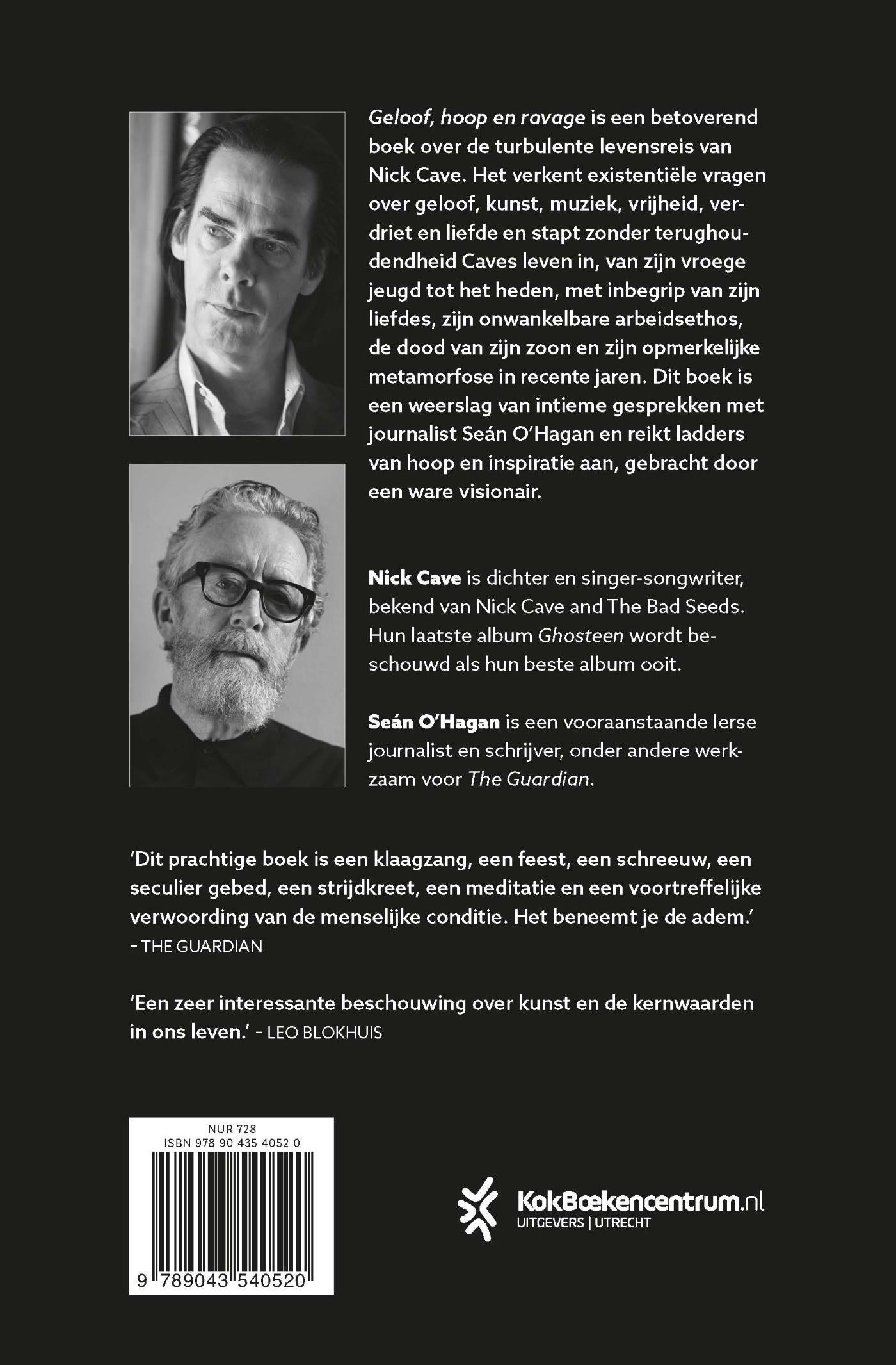 Geloof, hoop en ravage is een betoverend boek over de turbulente levensreis van Nick Cave. Het verkent existentiële vragen over geloof, kunst, muziek, vrijheid, verdriet en liefde en stapt zonder terughoudendheid Caves leven in, van zijn vroege jeugd tot het heden, met inbegrip van zijn liefdes, zijn onwankelbare arbeidsethos, de dood van zijn zoon en zijn opmerkelijke metamorfose in recente jaren. Dit boek is een weerslag van intieme gesprekken met journalist Seán O’Hagan en reikt ladders van hoop en inspiratie aan, gebracht door een ware visionair.