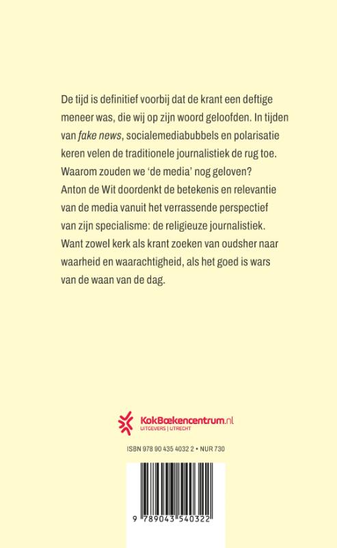 In Geloof jij het? doordenkt journalist Anton de Wit de betekenis en relevantie van de media vanuit het verrassende perspectief van zijn specialisme: de religieuze journalistiek. De tijd is definitief voorbij dat de krant een deftige meneer was, die wij op zijn woord geloofden. In tijden van fake news, socialemediabubbels en polarisatie keren velen de traditionele journalistiek de rug toe. Waarom zouden we ‘de media’ nog geloven? Dit boek is een zoektocht naar waarheid vanuit het oogpunt van zowel kerk als krant, want beide zoeken van oudsher naar waarachtigheid en beide zijn, als het goed is, wars van de modes van het moment.